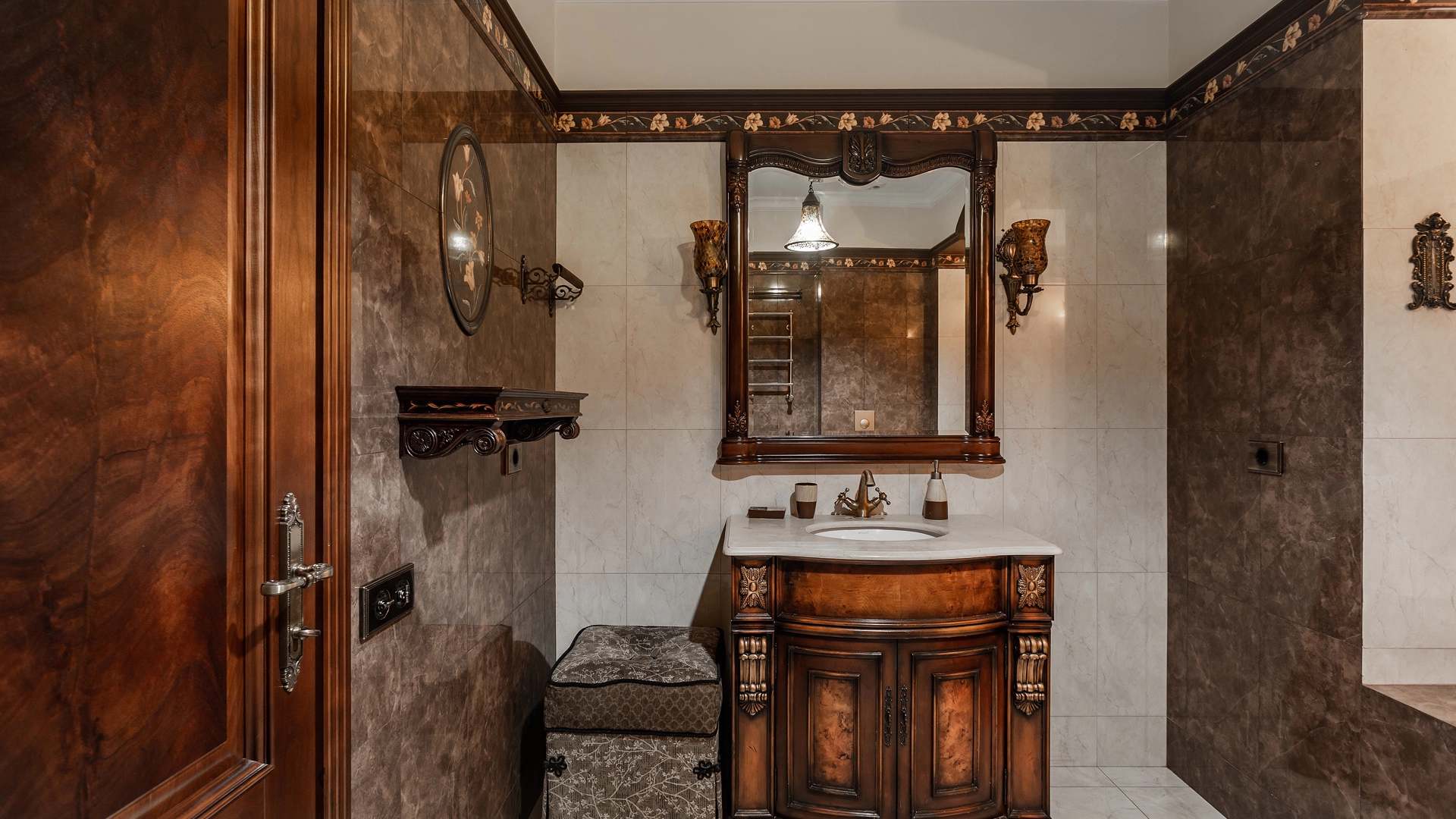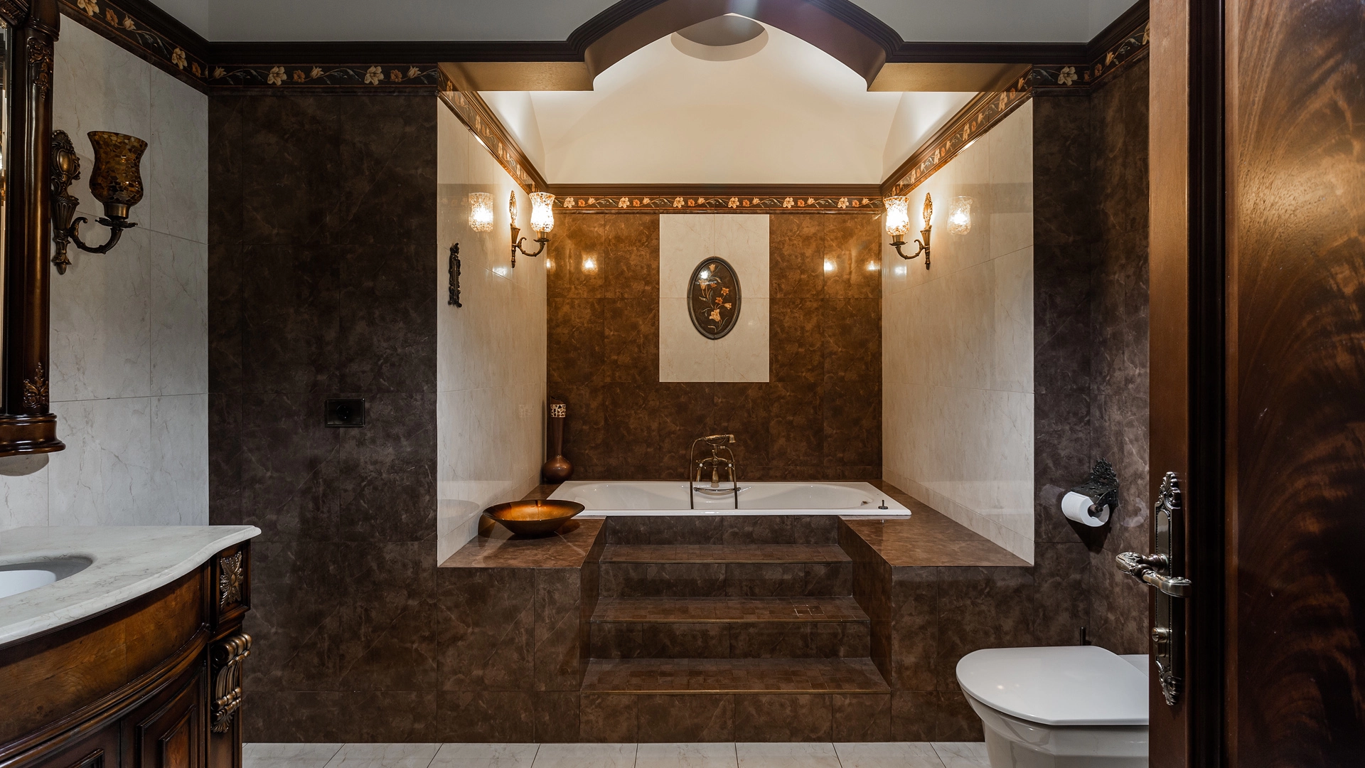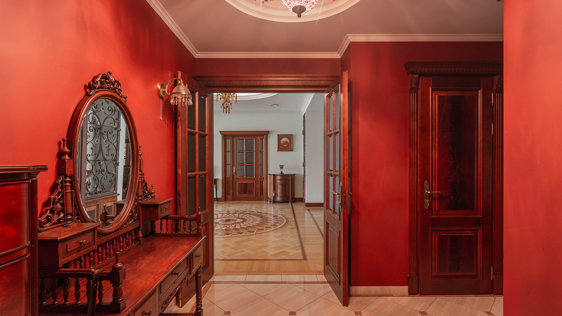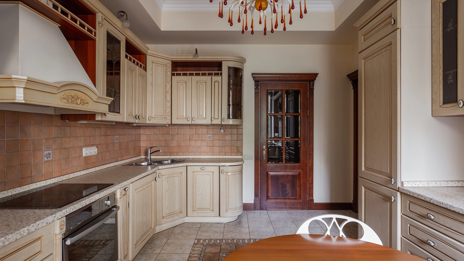 Квартира площадью 241 м² с зимним садом в комплексе «Венский дом» на 2 этаже. Выполнен ремонт в классическом стиле, в отделке использовано натуральное дерево и камень. На полу выложен светлый паркет с плетёным узором. Стены в спокойных тонах украшены картинами и светильниками в виде подсвечников. Квартира полностью меблирована, почти вся мебель из тёмного дерева. В гостиной с витражными дверьми спланирована зона отдыха у камина, столовая зона с круглым столом на 6 персон. Оборудована кухня цвета слоновой кости с бытовой техникой. На застеклённой террасе обустроен зимний сад с мягкими диванами в леопардовой обивке.