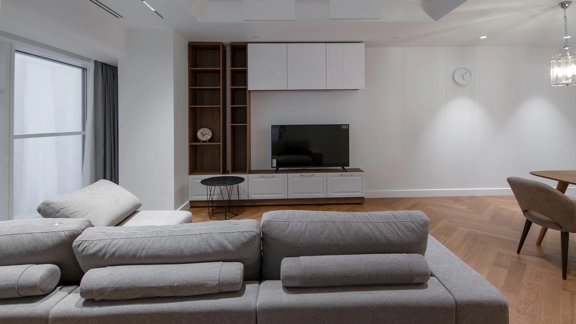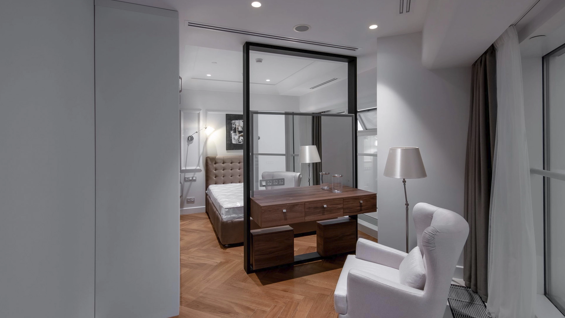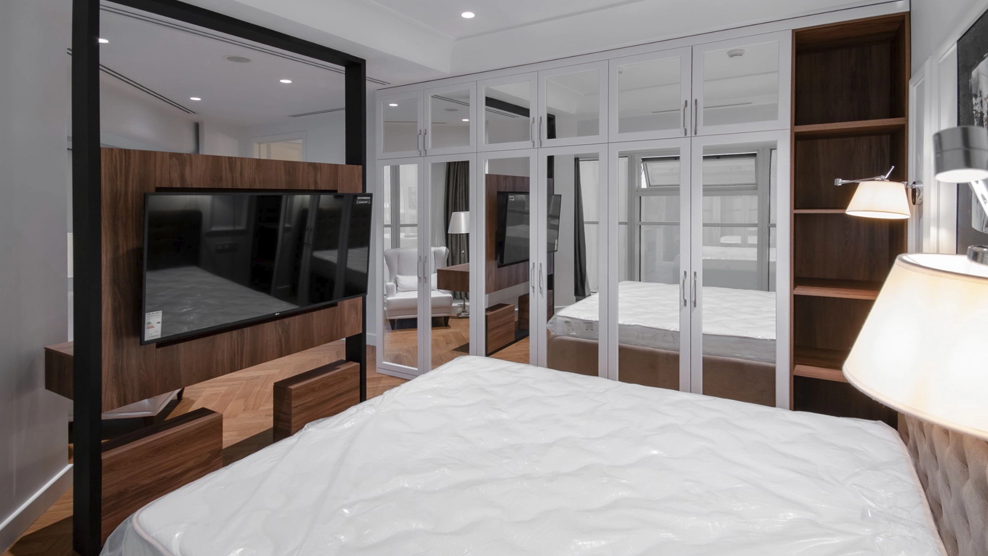 Апартаменты с 1-й спальней общей площадью 88 м² на 47-этаже 75-этажного жилого комплекса «Меркурий». В стильном интерьере преобладают светлые оттенки: белые шкафы и кухонный гарнитур гармонично сочетаются с паркетом, элементами под дерево и серым мягким диваном. Тщательно продуманные системы хранения позволят удобно расположить все ваши вещи и аксессуары. Благодаря панорамным окнам и точечному освещению комнаты наполнены светом и уютом. Планировка включает кухню-гостиную, спальню, гардеробную, ванную комнату и прихожую.