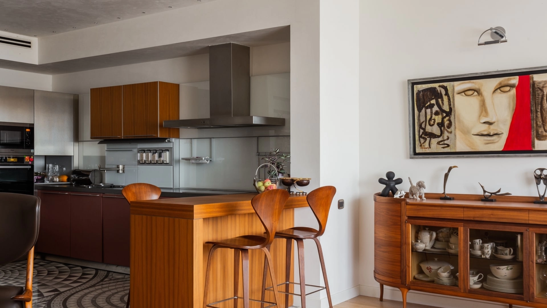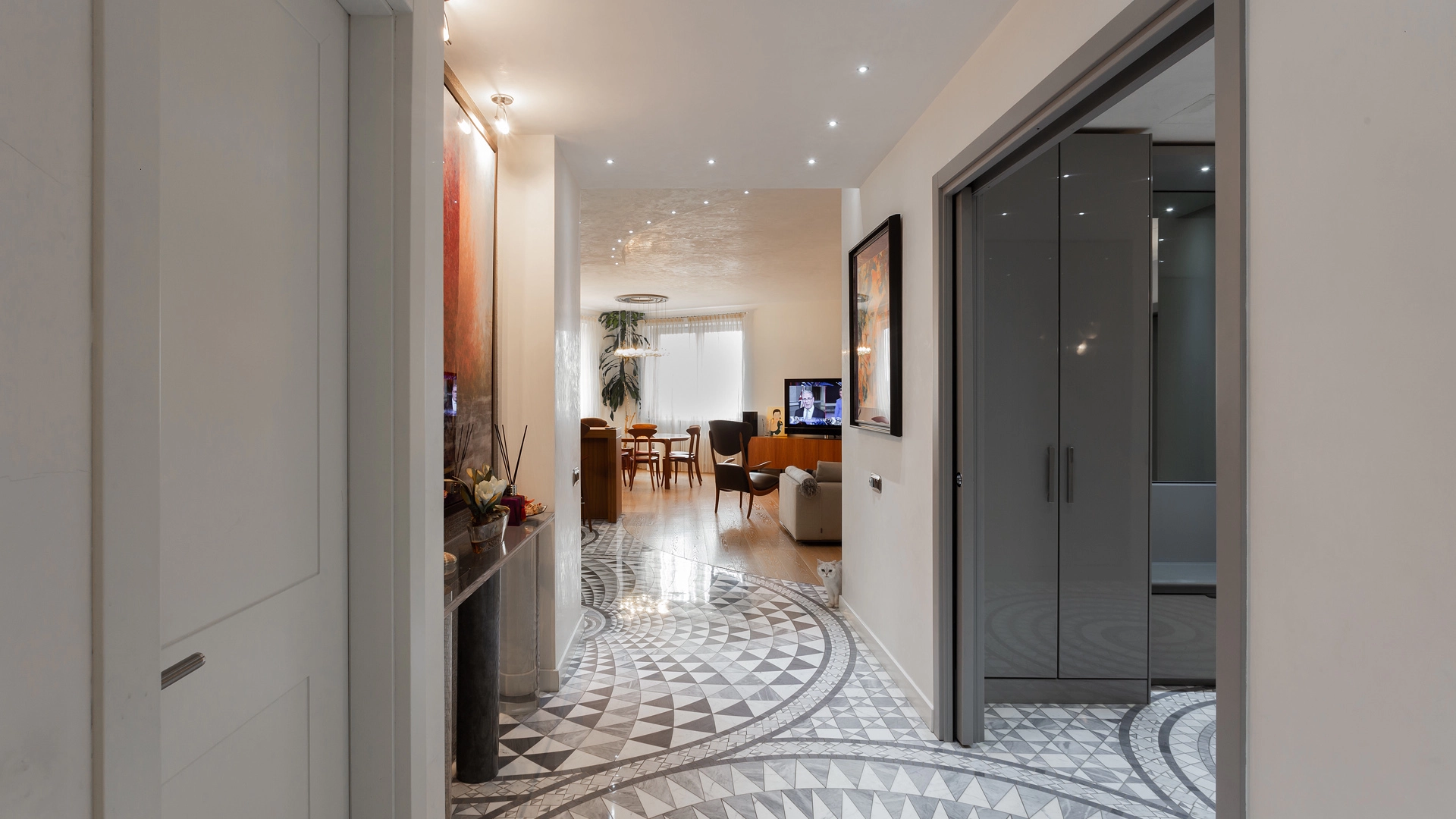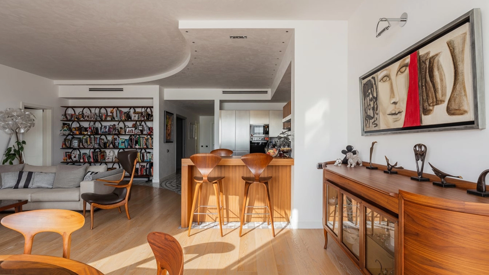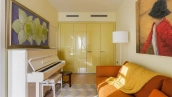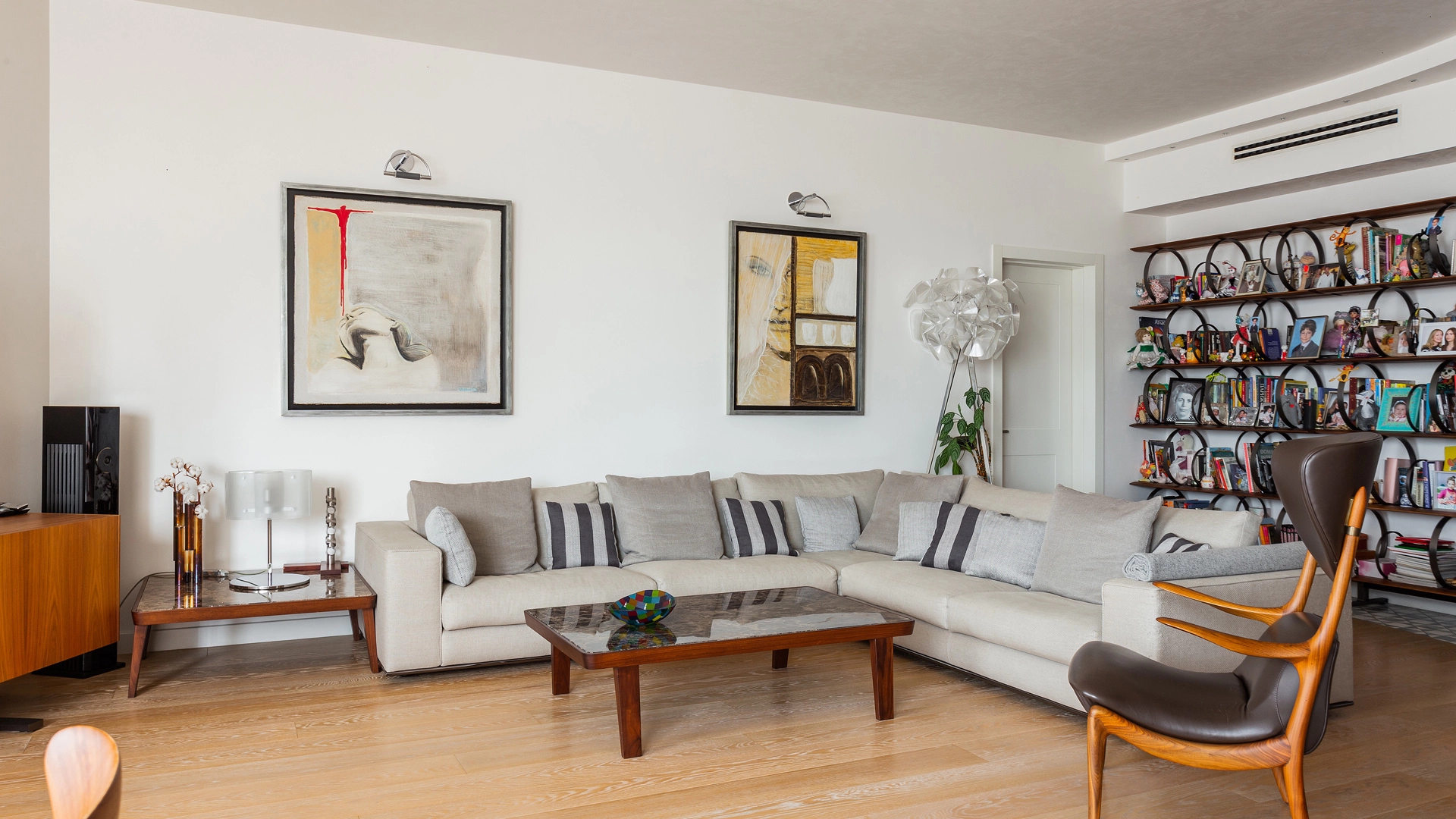 Просторная квартира с 3-мя спальнями в комплексе премиум-класса «Смоленская Застава» в Хамовниках. Квартира общей площадью 196 м² расположена на 14-м этаже. Выполнен дизайнерский ремонт в уникальном авторском стиле. Стены украшены картинами, в коридорах и ванных комнатах выложена мозаика Sicis. Установлена итальянская мебель от фабрик Ceccotti и Minotti. Из окон открывается вид на город и башни делового центра «Москва-Сити».
