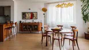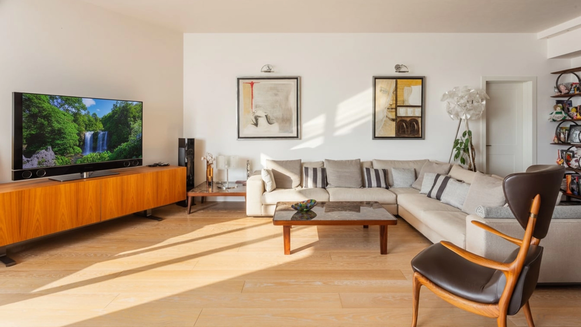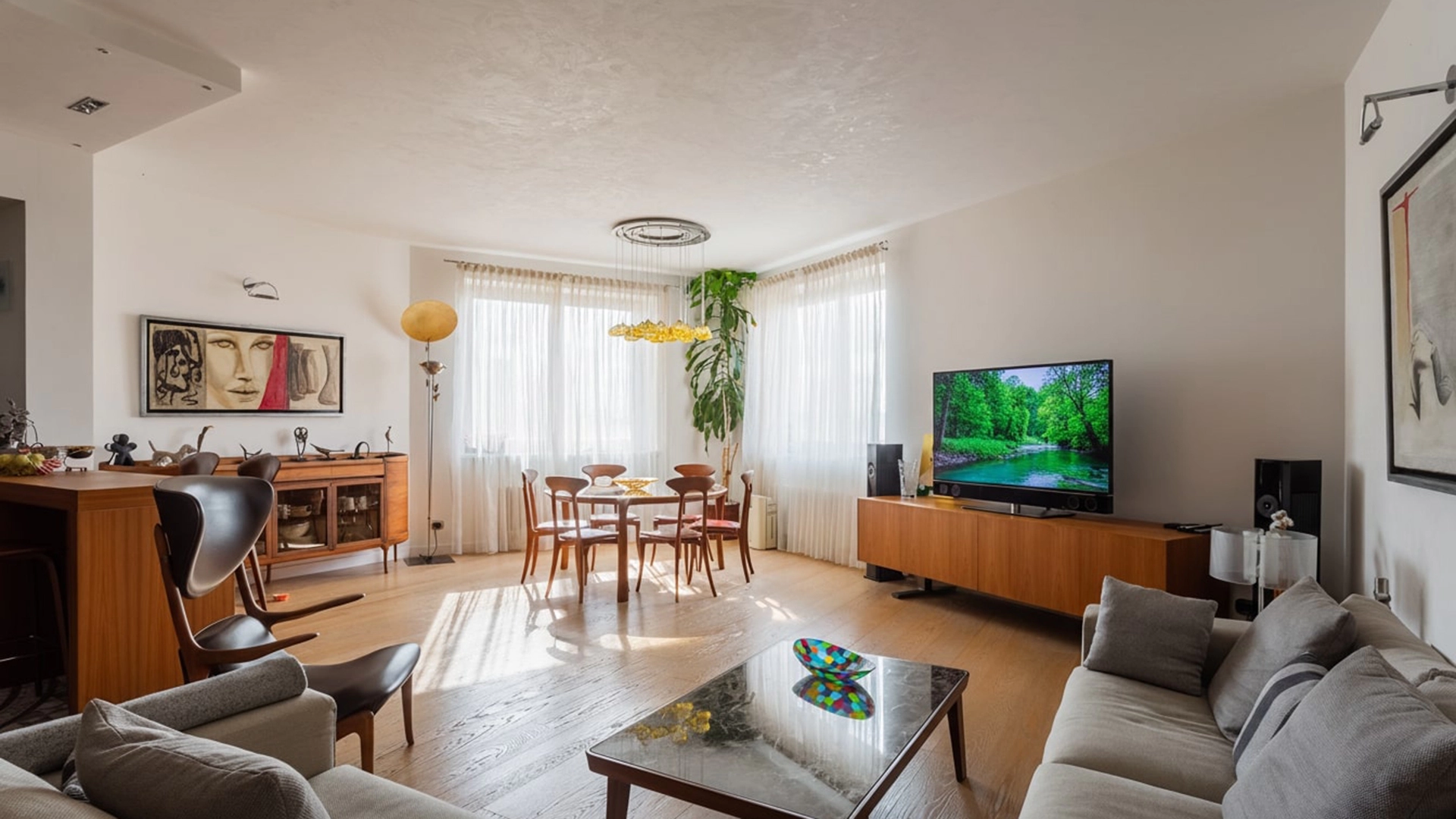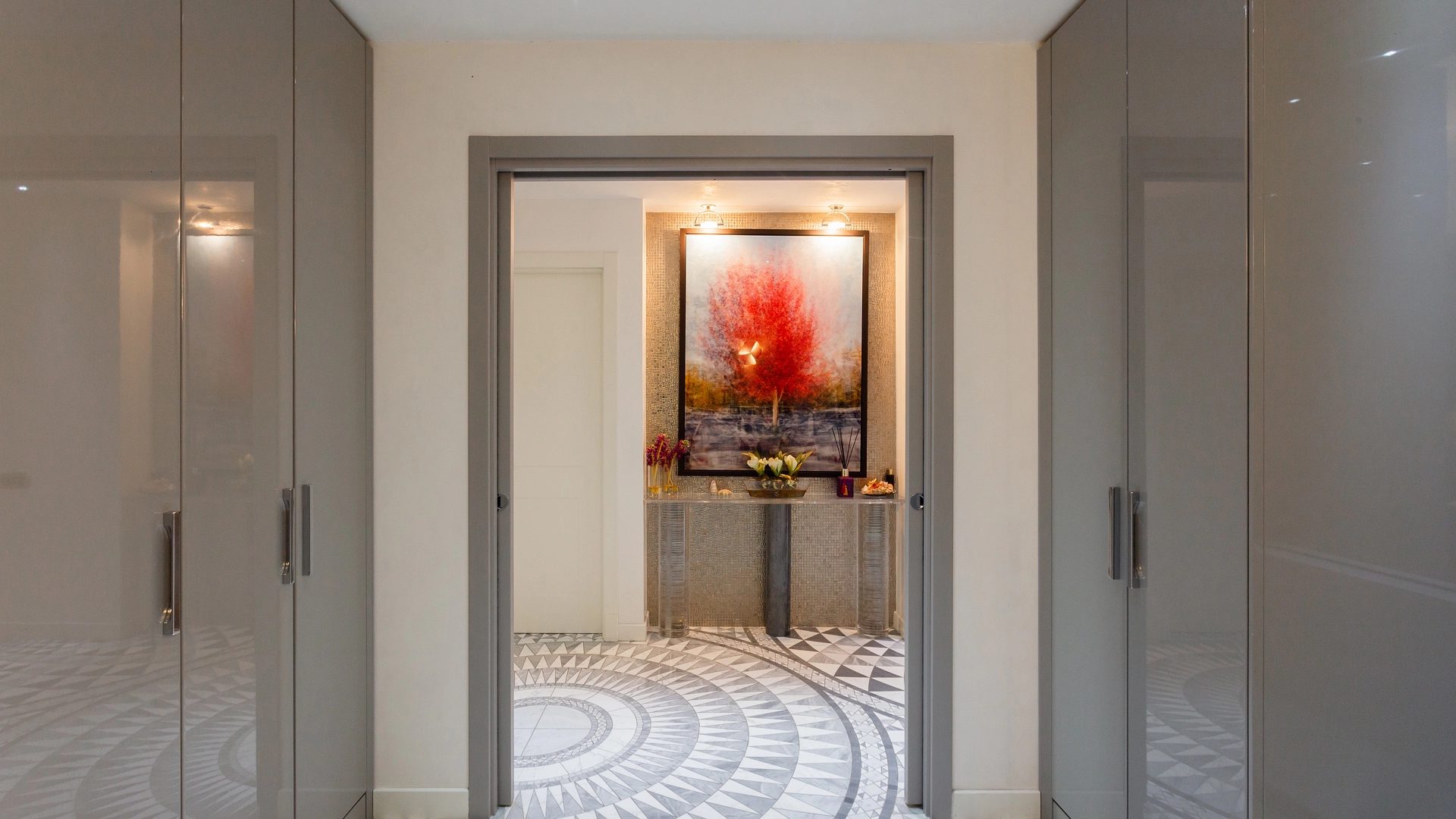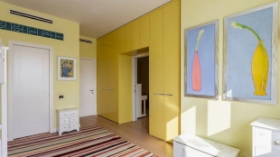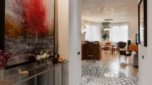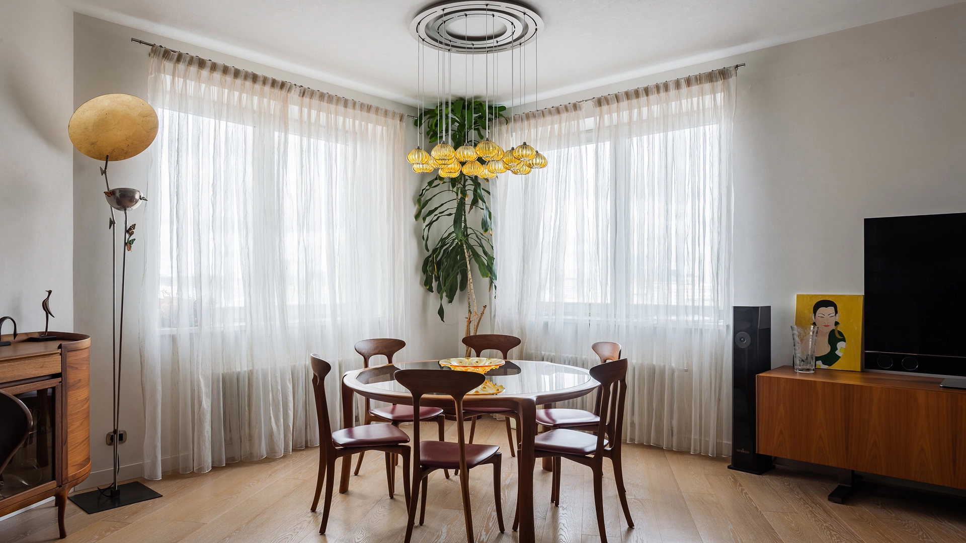 Просторная квартира с 3-мя спальнями в комплексе премиум-класса «Смоленская Застава» в Хамовниках. Квартира общей площадью 196 м² расположена на 14-м этаже. Выполнен дизайнерский ремонт в уникальном авторском стиле. Стены украшены картинами, в коридорах и ванных комнатах выложена мозаика Sicis. Установлена итальянская мебель от фабрик Ceccotti и Minotti. Из окон открывается вид на город и башни делового центра «Москва-Сити».