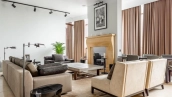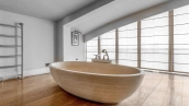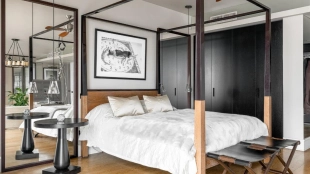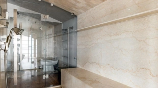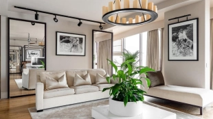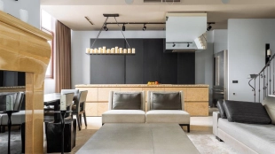 Двухуровневый пентхаус с террасой на 15-м этаже комплекса «Ближняя дача» в районе Очаково-Матвеевское. Выполнена отделка по авторскому дизайн-проекту с использованием натурального камня и дерева. Интерьеры укомплектованы мебелью от Christian Liaigre и Fendi, оборудован декоративный биокамин. Установлены кухня и системы хранения от итальянской фабрики Minotti. Ванна выполнена из цельного травертина, душевая из мрамора оснащена паровой системой Effigibbi.