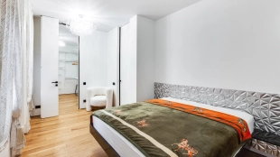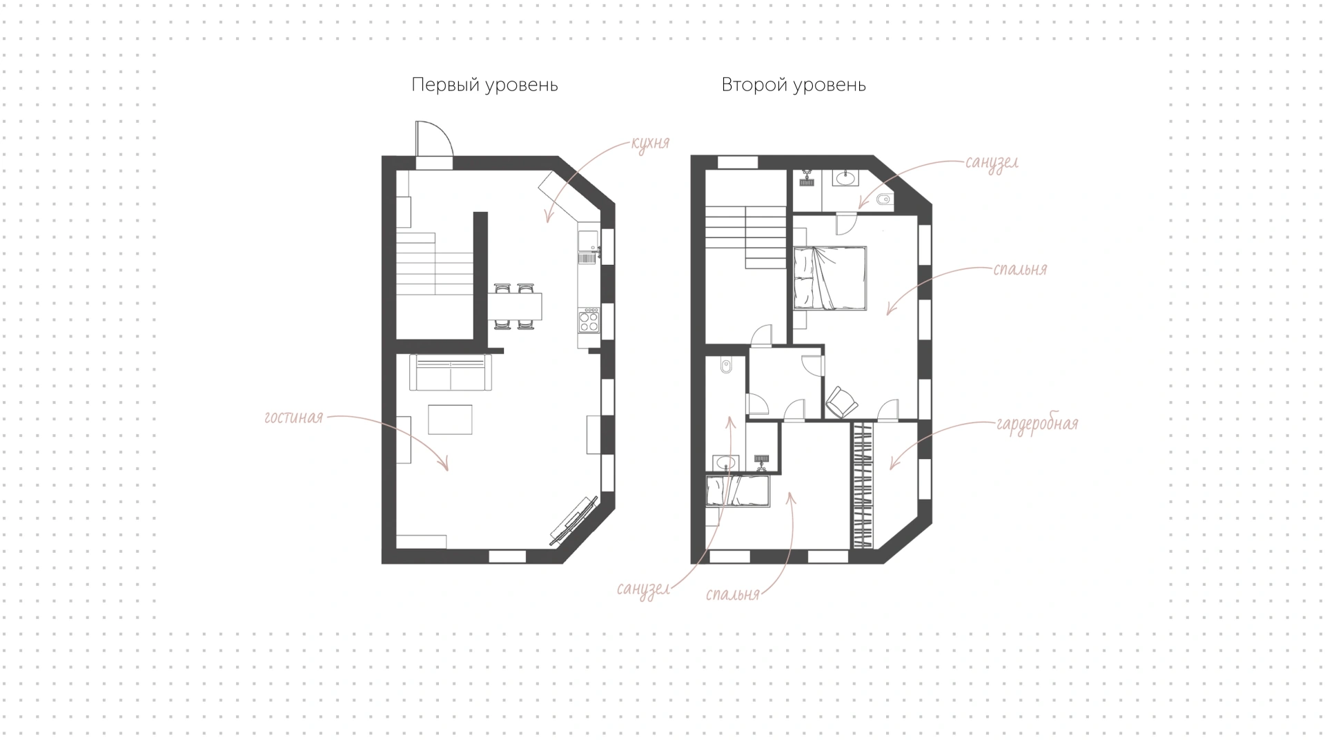 На первом этаже располагается прихожая и просторная кухня-гостиная со встроенной техникой Bosh. Полы с подогревом выстланы керамогранитом. Второй этаж состоит из мастер-спальни и детской комнаты. Кровати оборудованы дополнительной подсветкой. На каждом этаже совмещённые санузлы, установлен бойлер на 400 литров. На кухне установлен фильтр для воды.
