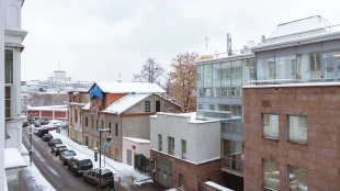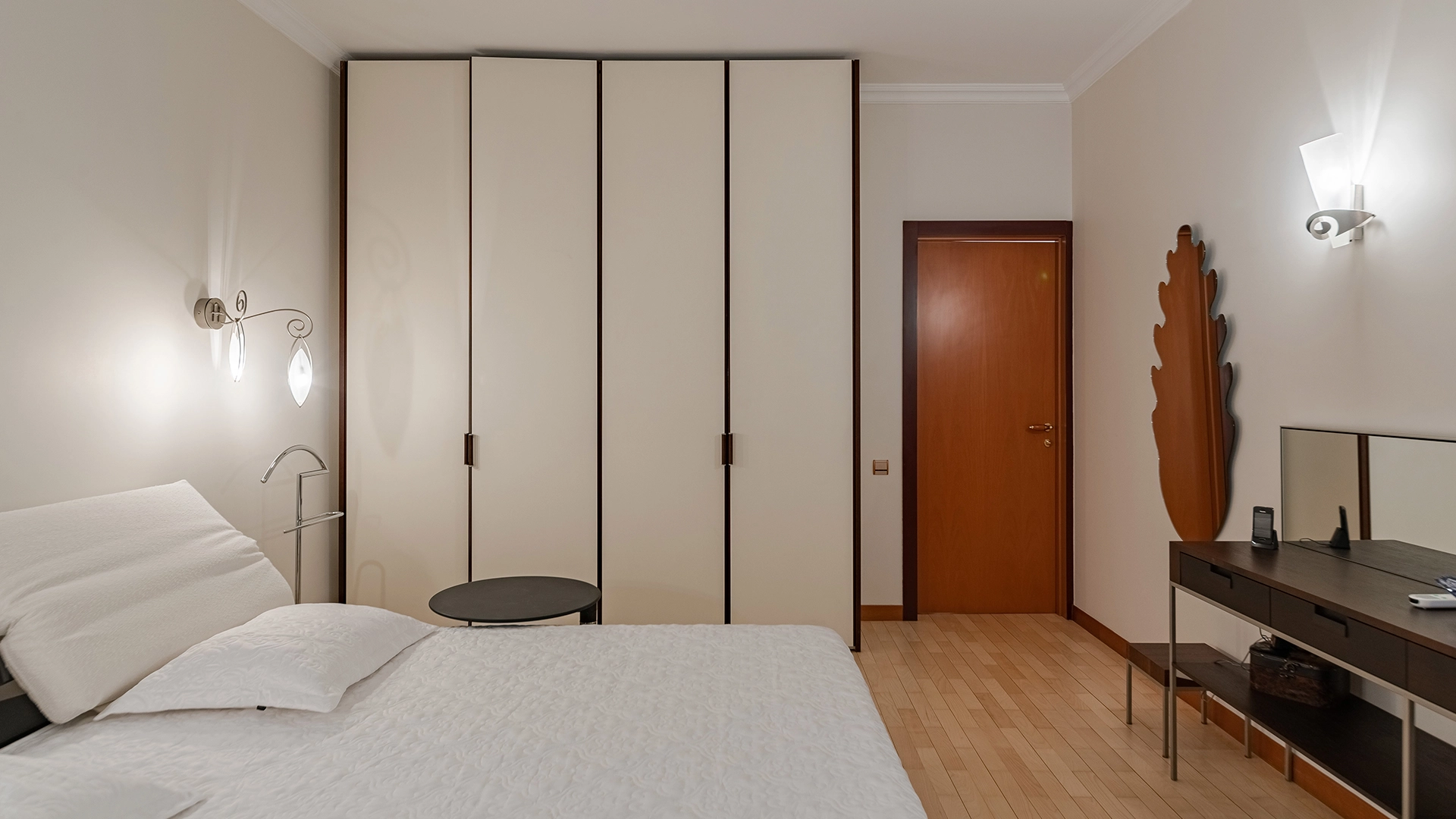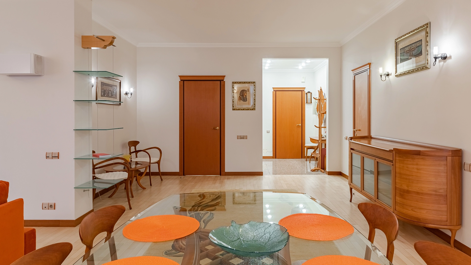 Квартира с 2-мя спальнями общей площадью 150 м² в доме Opera House на «Золотой Миле» в Хамовниках. Выполнена светлая отделка в современном стиле. В оформлении интерьера сочетаются стекло и натуральное дерево благородных коричневых оттенков. Квартира полностью укомплектована мебель. Кухня со встроенной техникой зонирована барной стойкой.