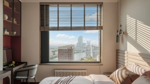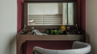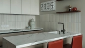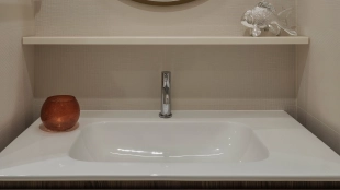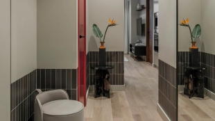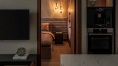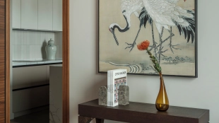 Уютная квартира с 1-й спальней в комплексе бизнес-класса «Береговой» на берегу Москвы-реки. Квартира общей площадью 46 м² расположена на 26-м этаже. Выполнен дизайнерский ремонт в стиле «джапанди» в лаконичных светлых тонах. В отделке использованы натуральные материалы — керамогранит, дуб, орех, кварц, мрамор, натуральный камень. Интерьер дополняют элементы мозаики и живопись. Панорамные окна наполняют пространство светом и открывают вид на реку и башни делового центра «Москва-Сити».
