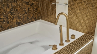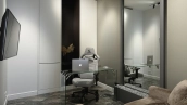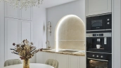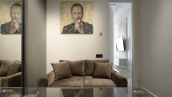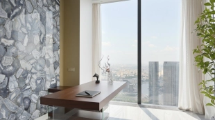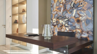 Стеновая панель из агата с подсветкой добавляет кабинету особый шарм — здесь приятно уделять время работе. А в конце насыщенного дня устройте приятные процедуры в ванной комнате с пышным зеленым бонсаем и стеной из благородного камня «тигровый глаз», сверкающим будто золотые россыпи. В комнатах всё продумано до мелочей: блеск полированных поверхностей, игра света, гармония природных фактур и тонов.