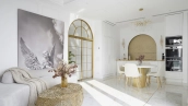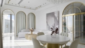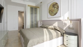 Интерьеры оформлены в светлой цветовой палитре с утонченными золотыми акцентами, элементами декора и премиальной мебелью. Мраморное полы во всех комнатах, кроме детской спальни, мягко отражают свет, зрительно увеличивая пространство. Стены большой спальни украшены лепниной и сусальным золотом, переливающимся бликами на солнце, а изысканная мебель и подвесные светильники в виде горного хрусталя подчёркивают стремление к совершенству в каждой детали.