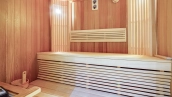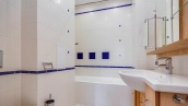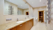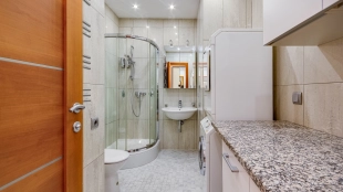 Планировка: просторная кухня-гостиная, 2 спальни с ванными комнатами, 2 спальни, 2 санузла, кладовая, холл. Всего в квартире 4 полноценные ванные комнаты, в одной из них обустроена сауна. Из окон открывается вид на город, на улицу и во двор.