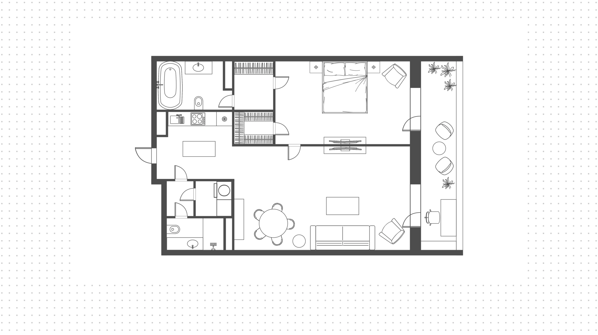 Планировка: холл, гостиная с зоной кухни, спальня с ванной комнатой и встроенной гардеробной, гостевой санузел. Из обеих комнат предусмотрен выход на просторную застеклённую лоджию с зоной кабинета. Лоджия отделена высокими раздвижными дверьми с решётчатыми панорамными окнами в тёмной раме. Окна квартиры ориентированы в благоустроенный внутренний двор.