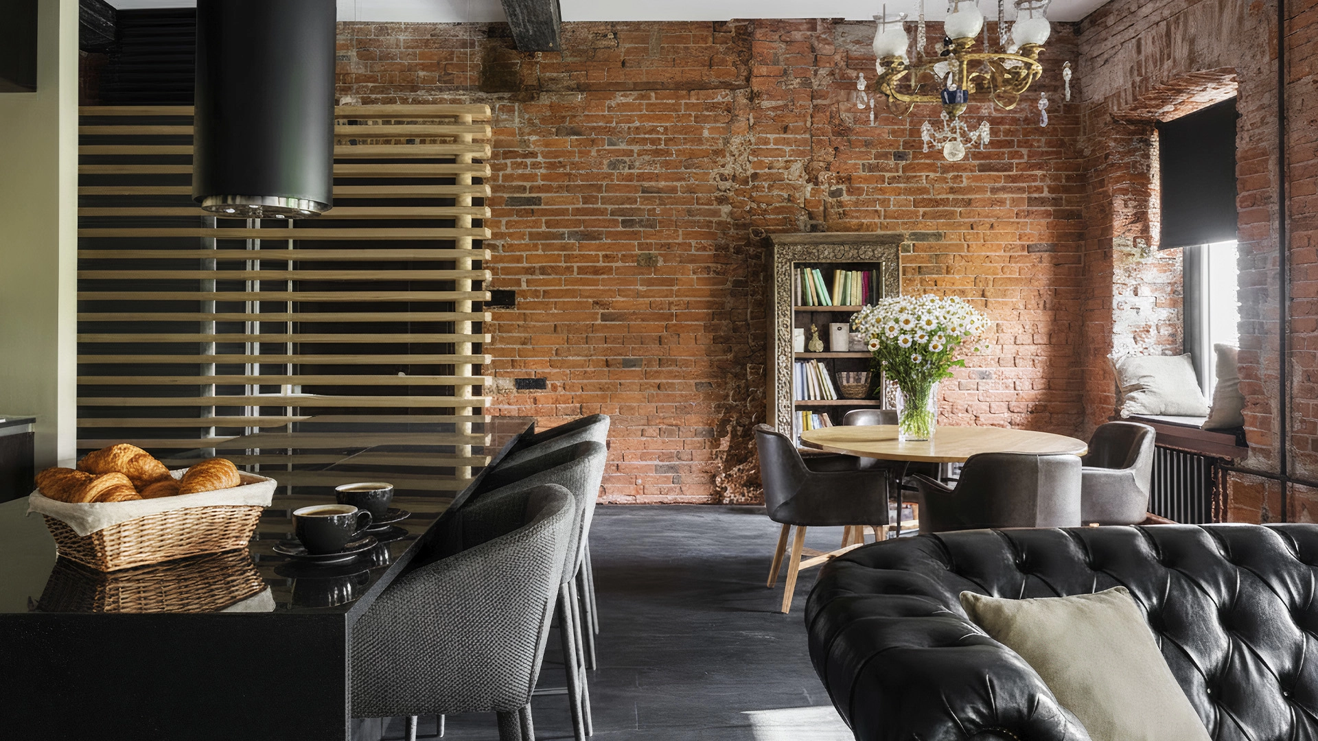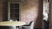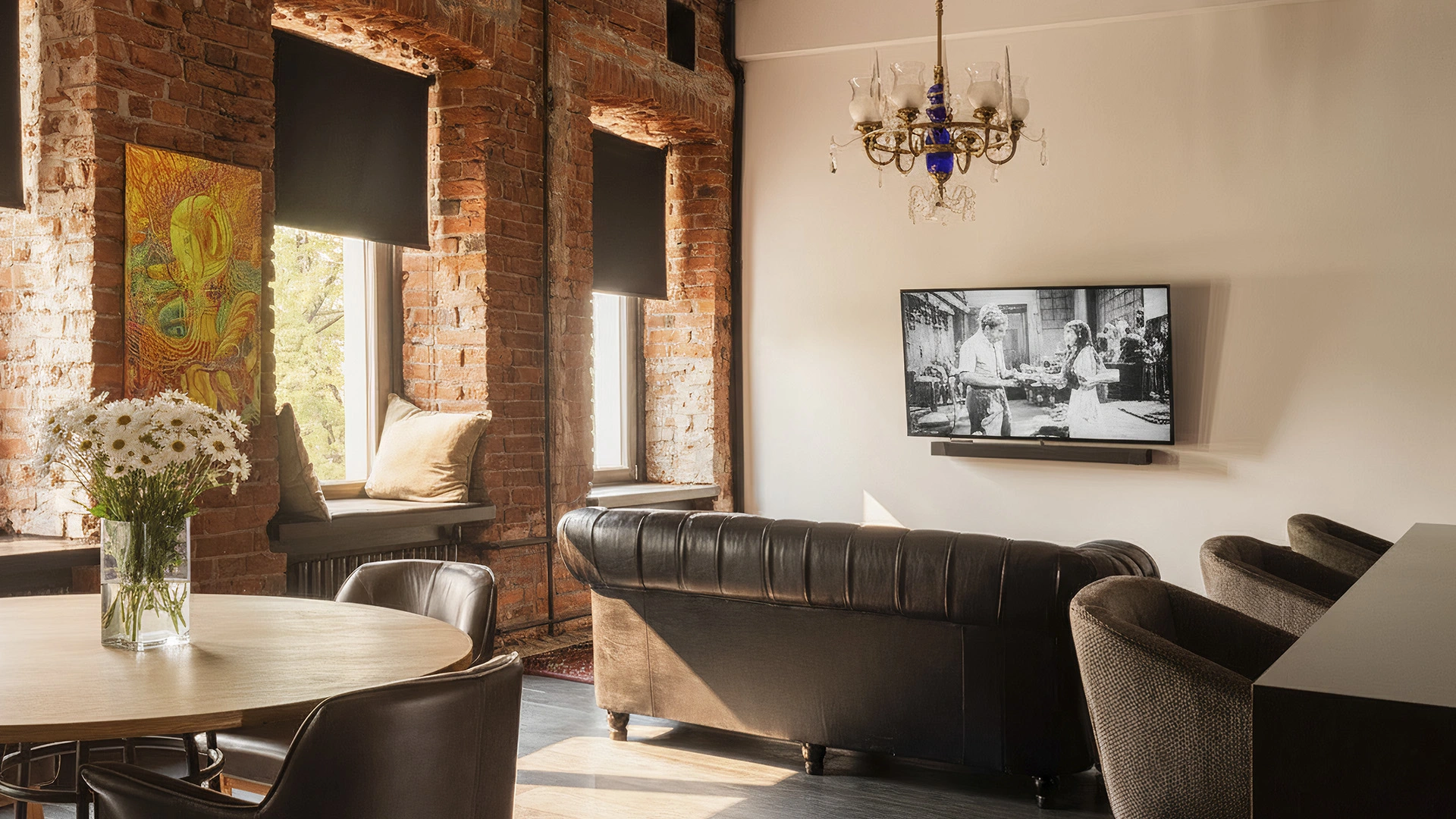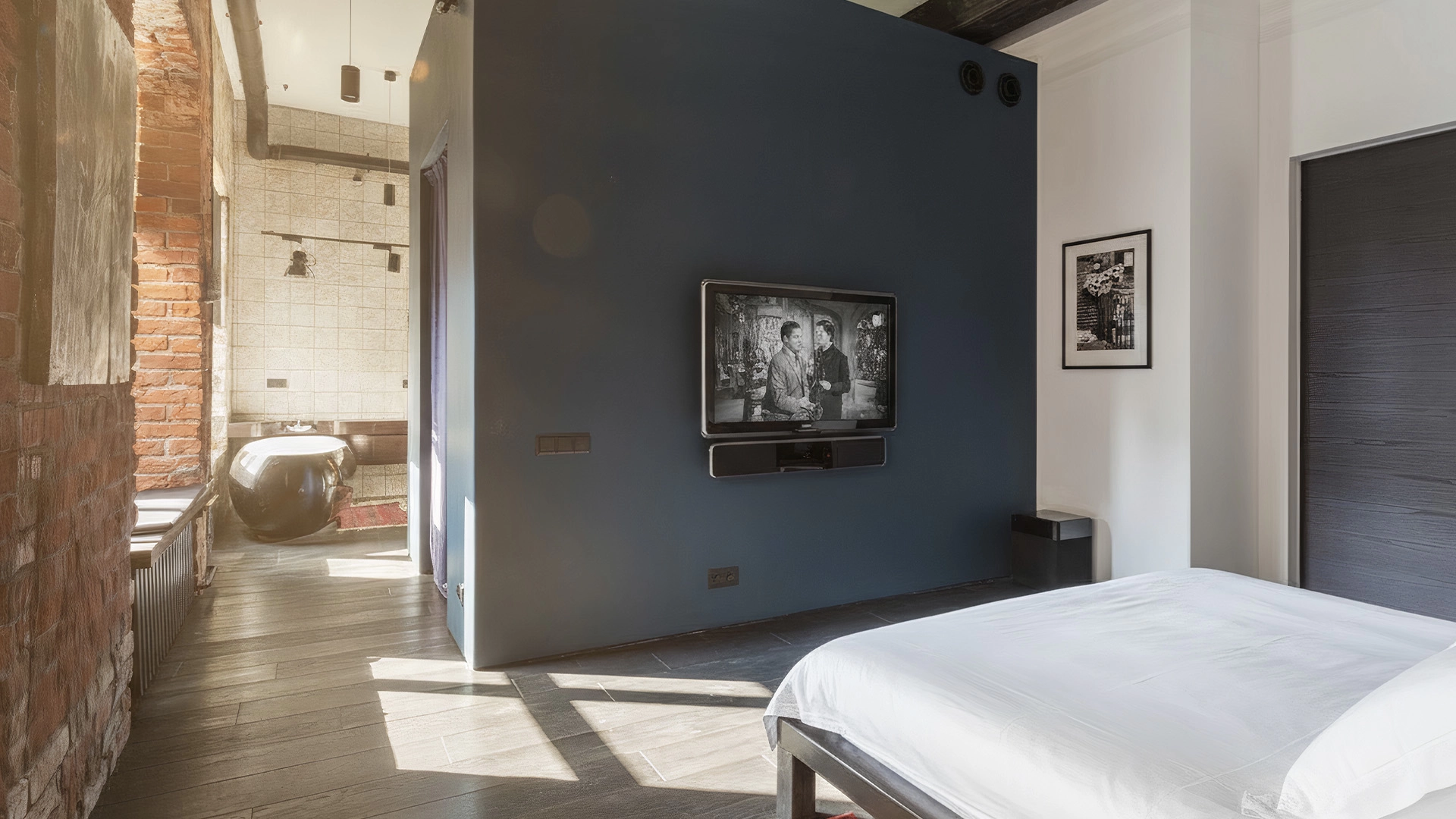 Дизайнерская квартира площадью 95 м² с видом на Патриарший пруд. Интерьер оформлен в стиле «лофт», украшен авторскими светильниками и картинами. В отделке использован классический красный кирпич, натуральное дерево. Спланирована просторная гостиная-столовая-кухня с 4-мя окнами, спальня со своей гардеробной и ванной комнатой, санузел с душевой.