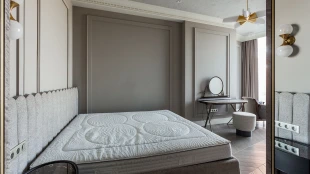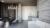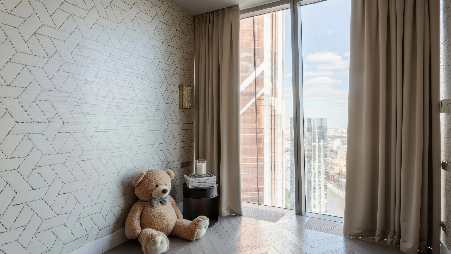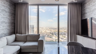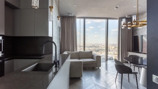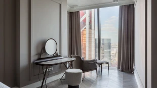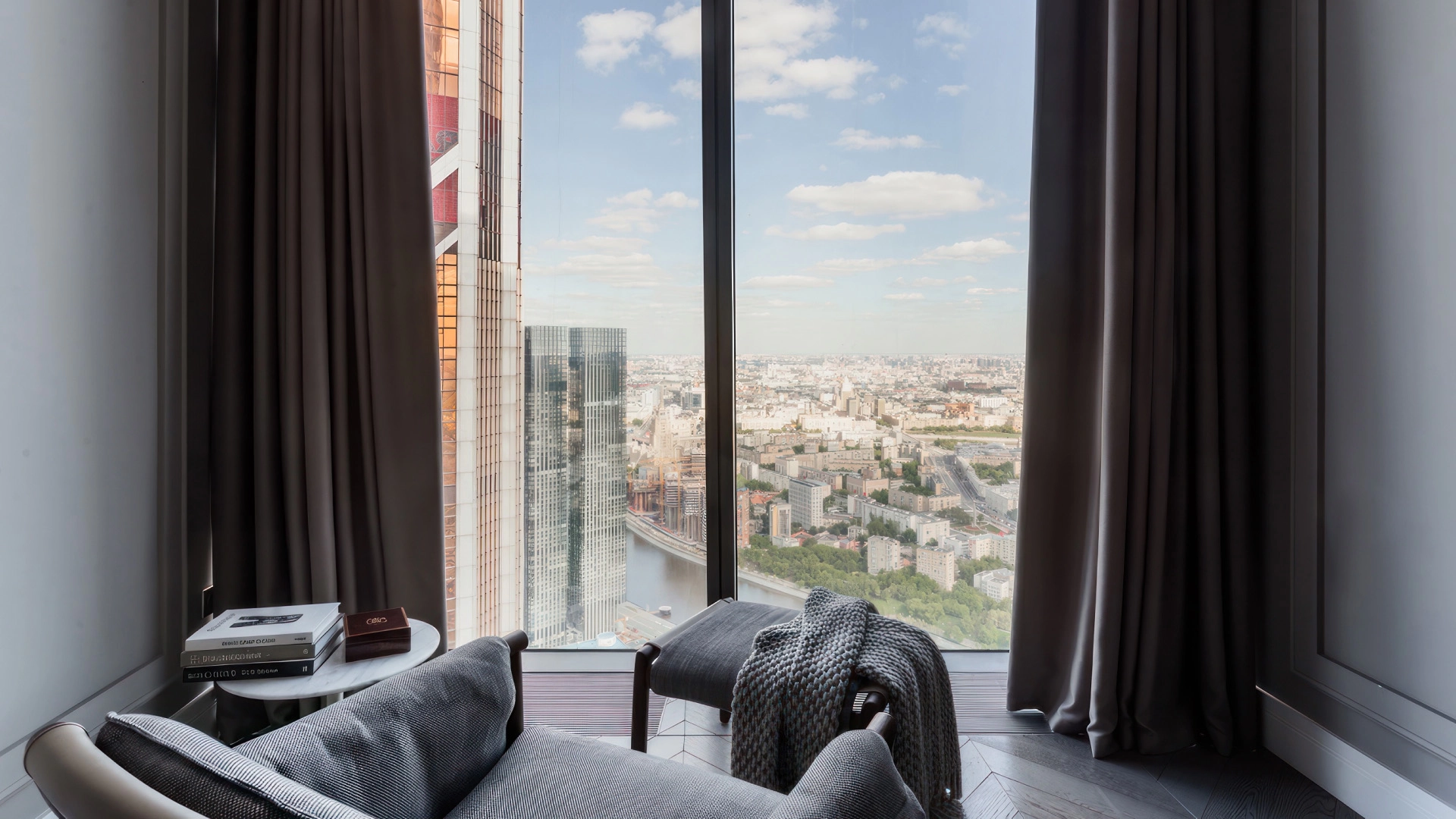 Видовые апартаменты с 2-мя спальнями общей площадью 110 м² в башне «Федерация». Выполнена премиальная дизайнерская отделка, в отделке использовано натуральное дерево. Иинтерьер оформлен в минималистичным современном стиле. Из окон открываются панорамные виды на реку, гостиницу «Украина» и центр города.