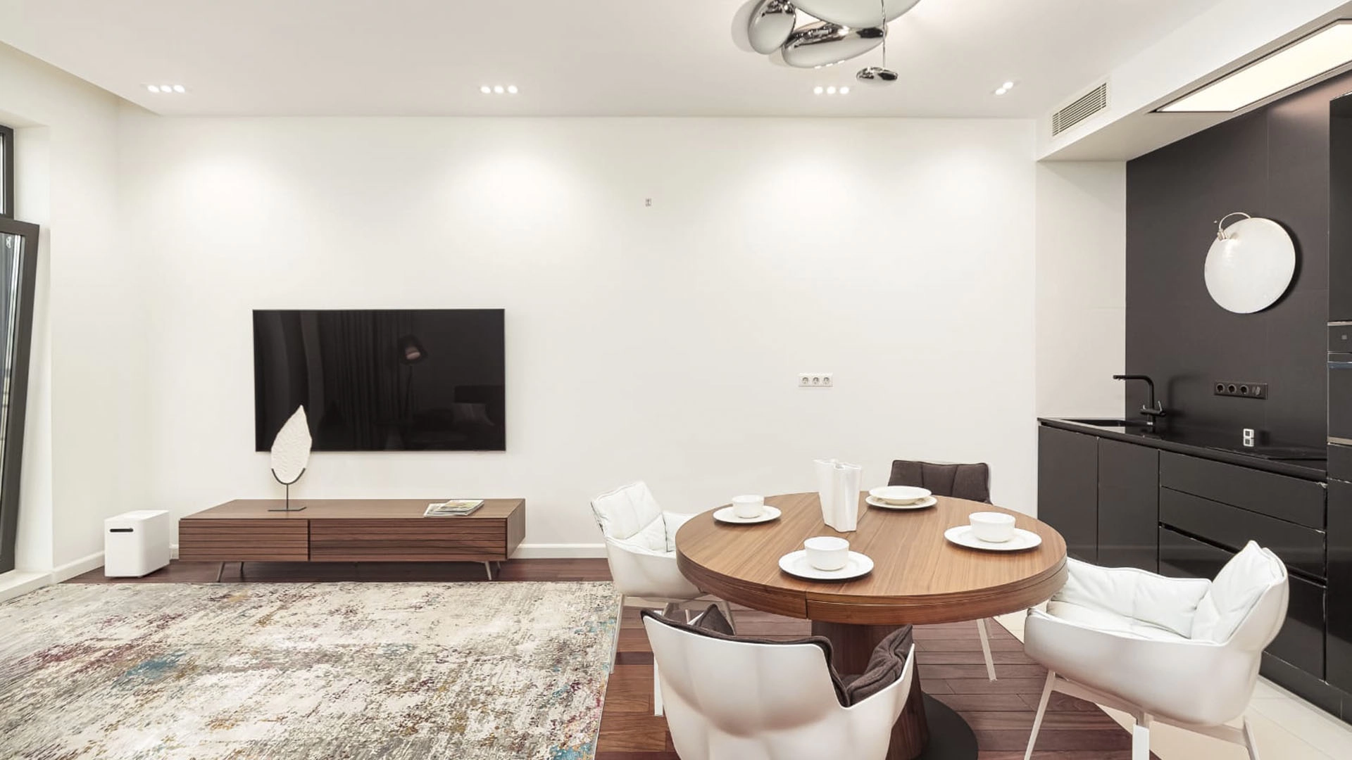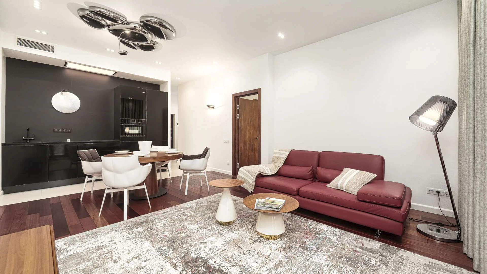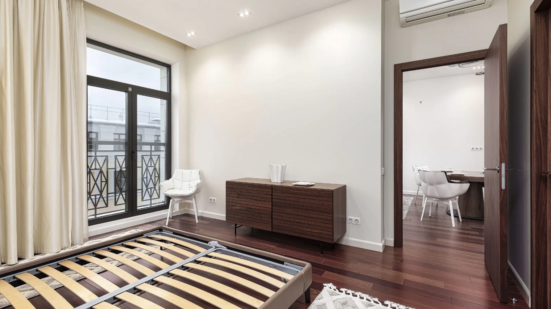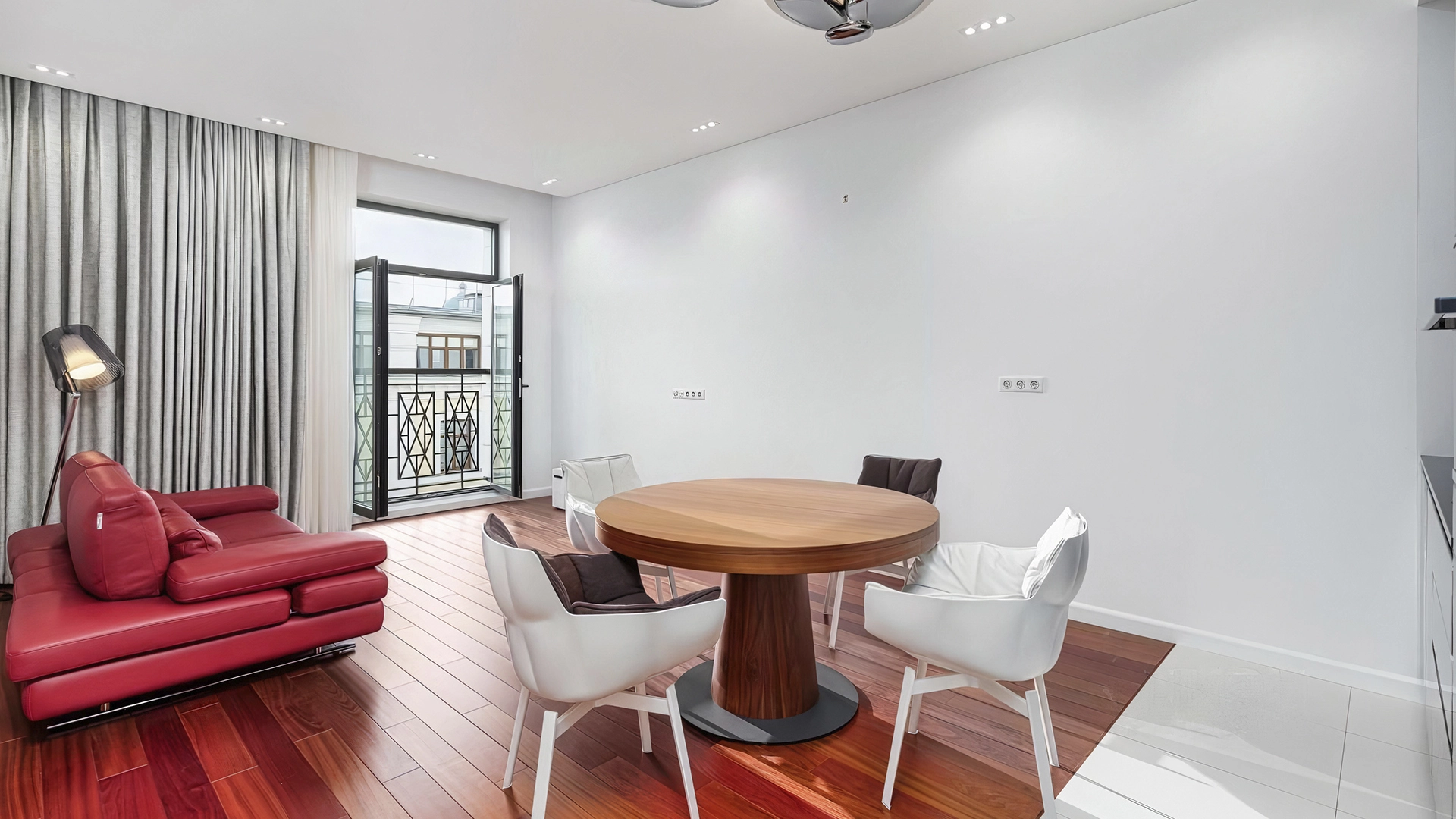 Видовые апартаменты в комплексе делюкс-класса «Софийский» на острове Балчуг в самом центре города. Выполнен современный ремонт, в интерьере использованы предметы итальянских дизайнеров Филипа Старка, Антонио Читтерио, Патриции Уркиола. Освещение от Artemide Skydro, Fabbian, Artemide Tolomeo. Высота потолков 3,2 метра.