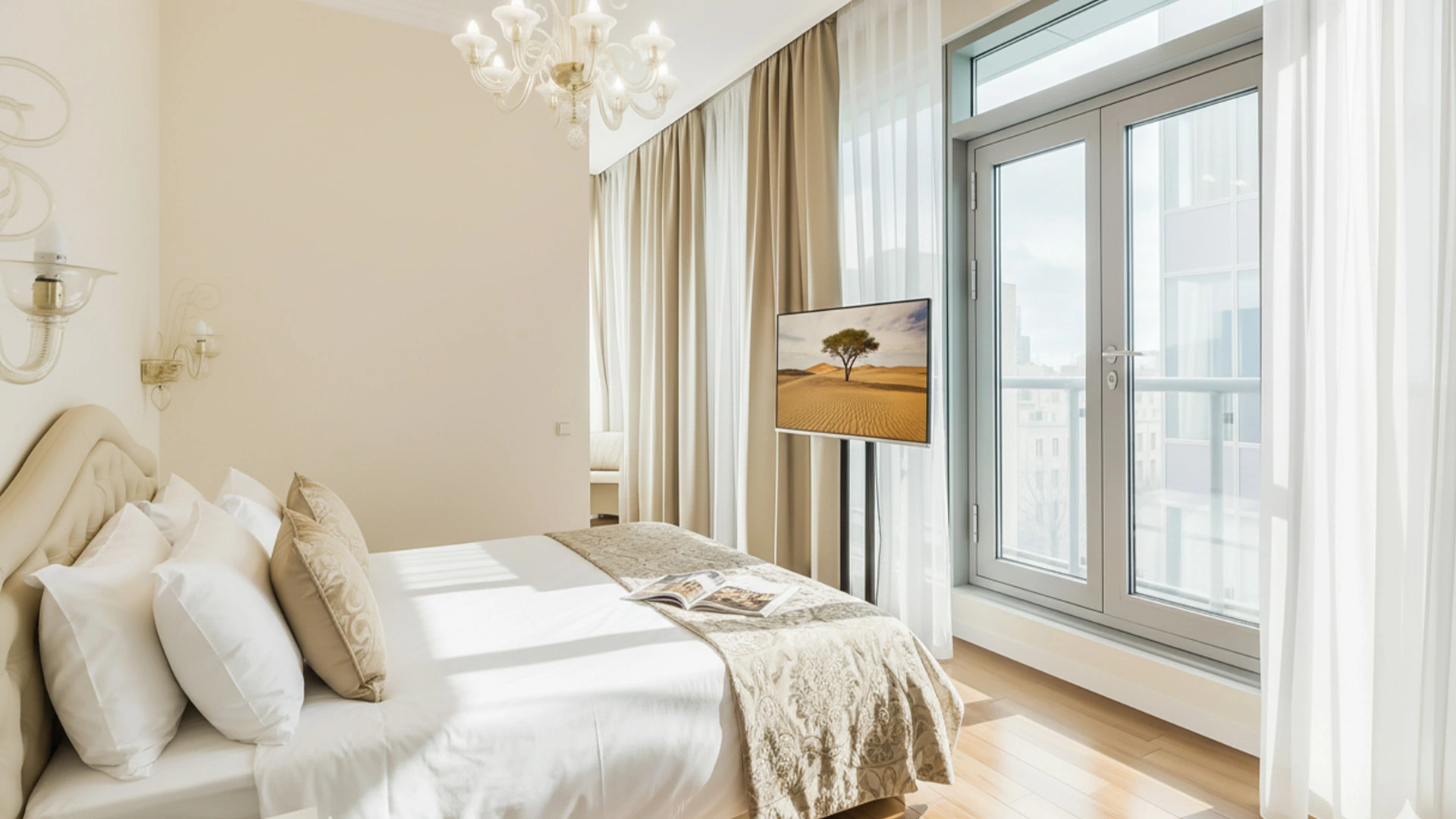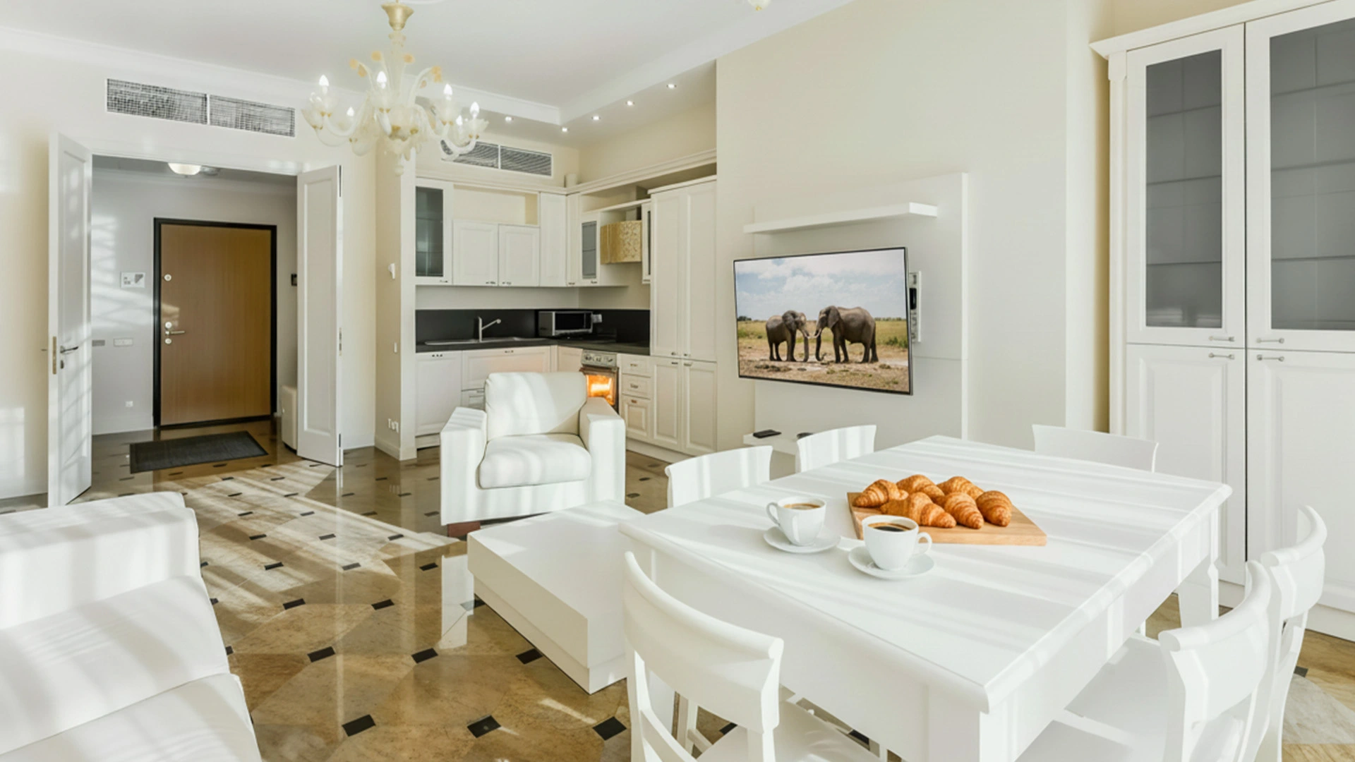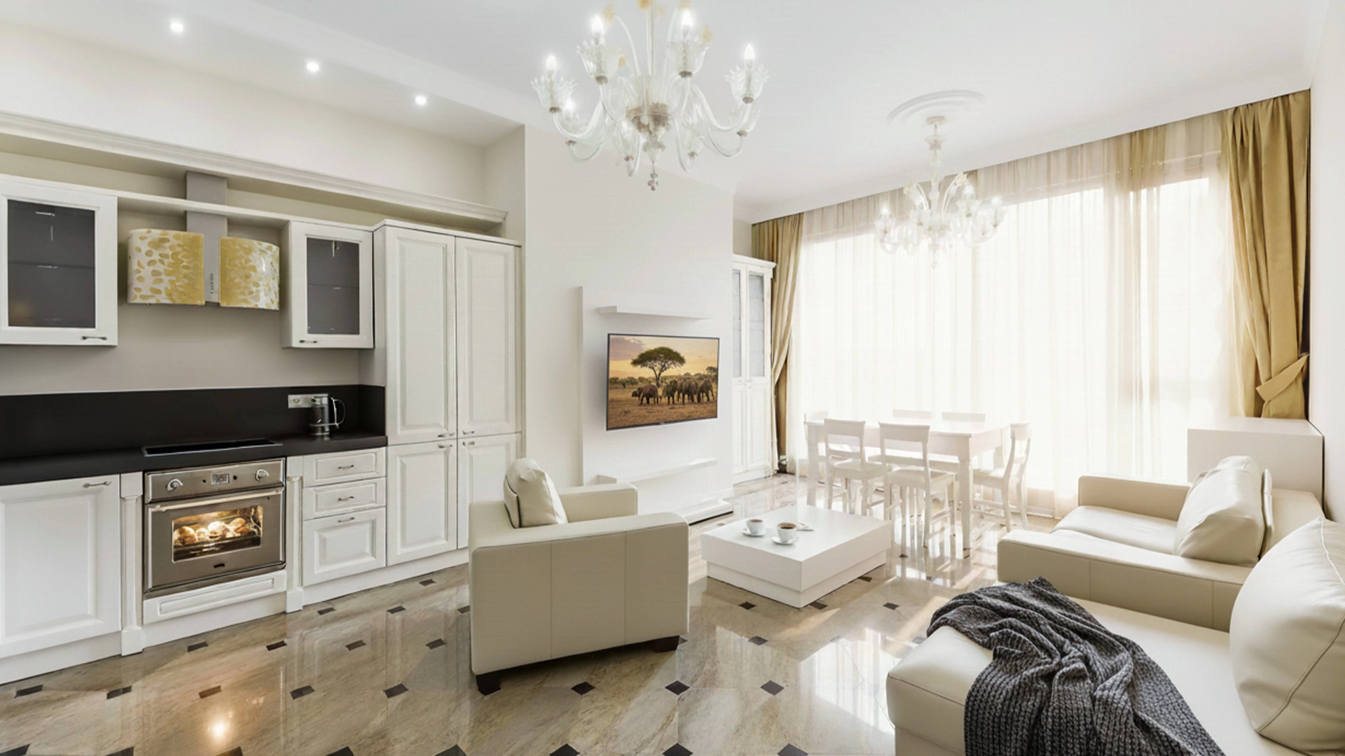 Квартира с 3-мя спальнями общей площадью 132 м² в комплексе премиум-класса «Четыре ветра». Выполнен дизайнерский ремонт в стиле современной классики. Интерьер оформлен в лаконичных светлых тонах, в отделке использовано натуральное дерево. Высота потолков 3 метра.