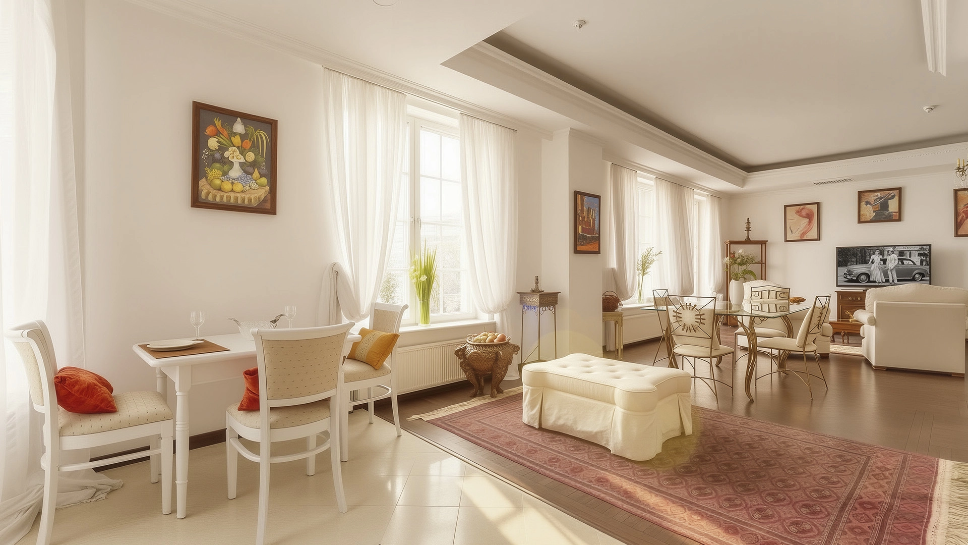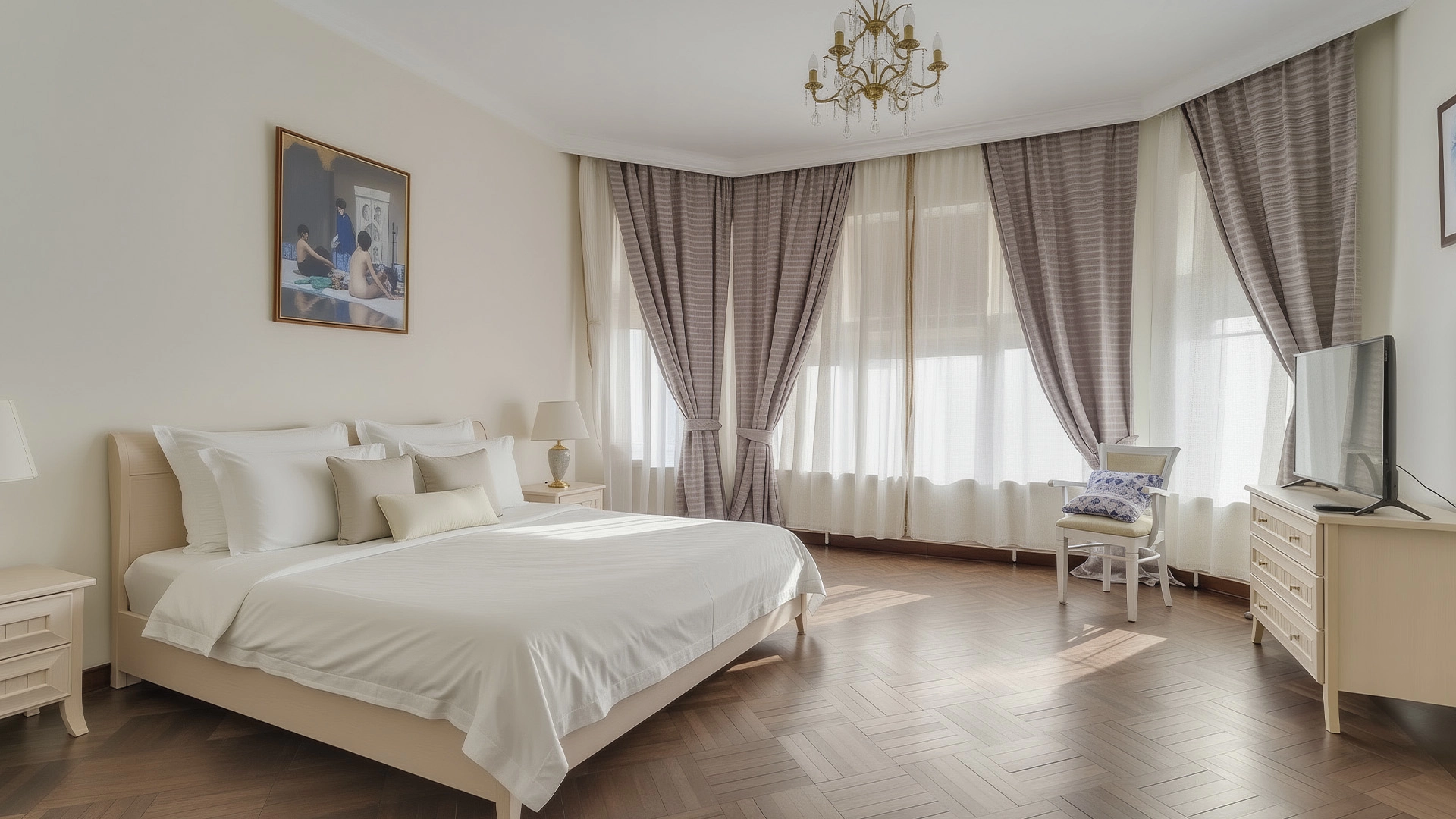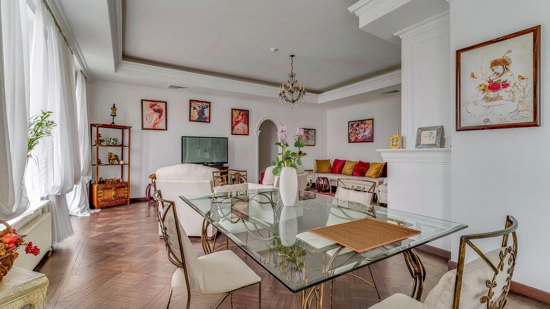 Видовая квартира с 2-мя спальнями общей площадью 150 м² в клубном комплексе «Агаларов Хаус». Выполнена светлая дизайнерская отделка в классическом стиле. Интерьер украшен картинами и подвесными люстрами. Распашные панорамные окна, потолки высотой 3,2 метра.