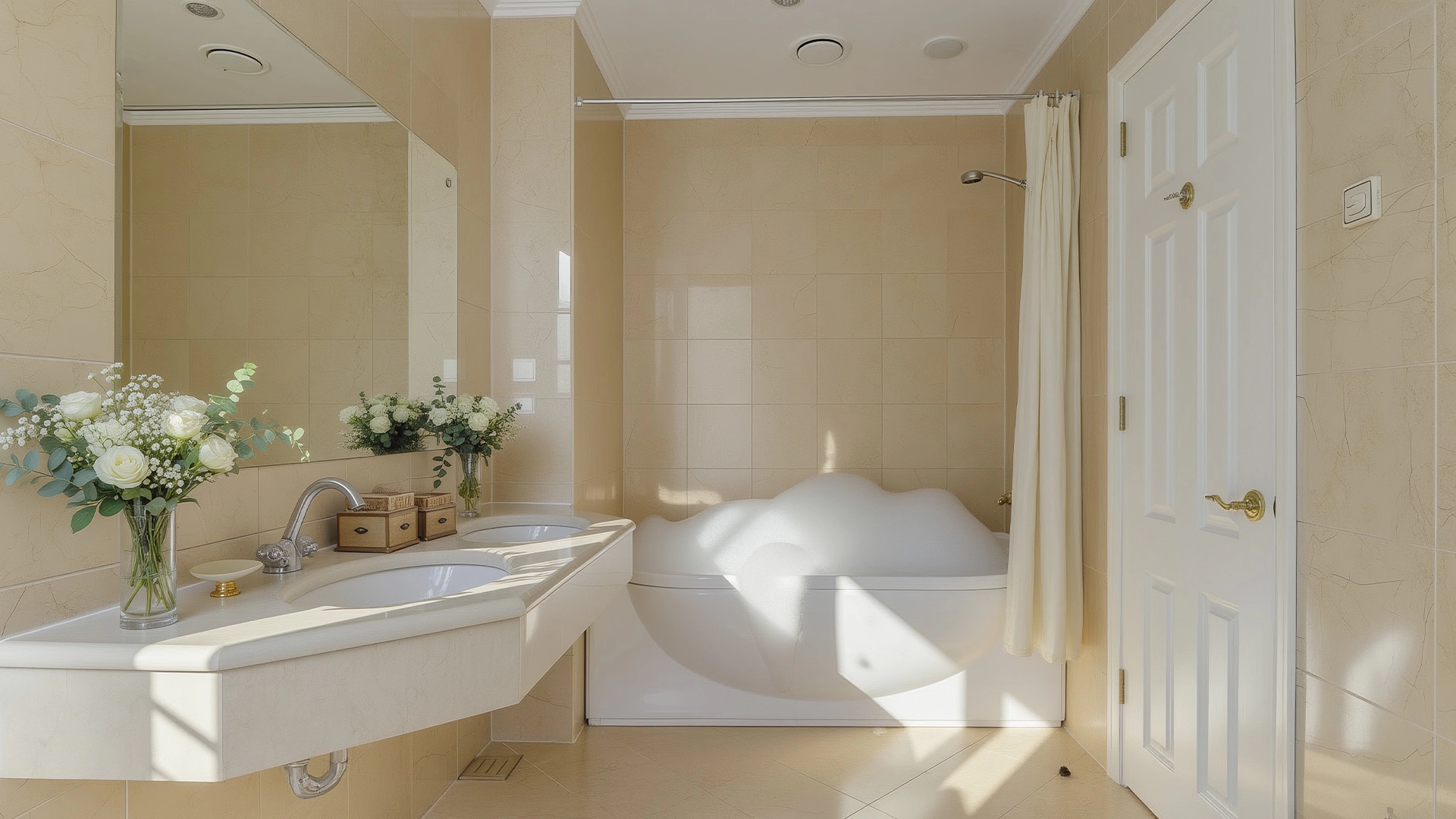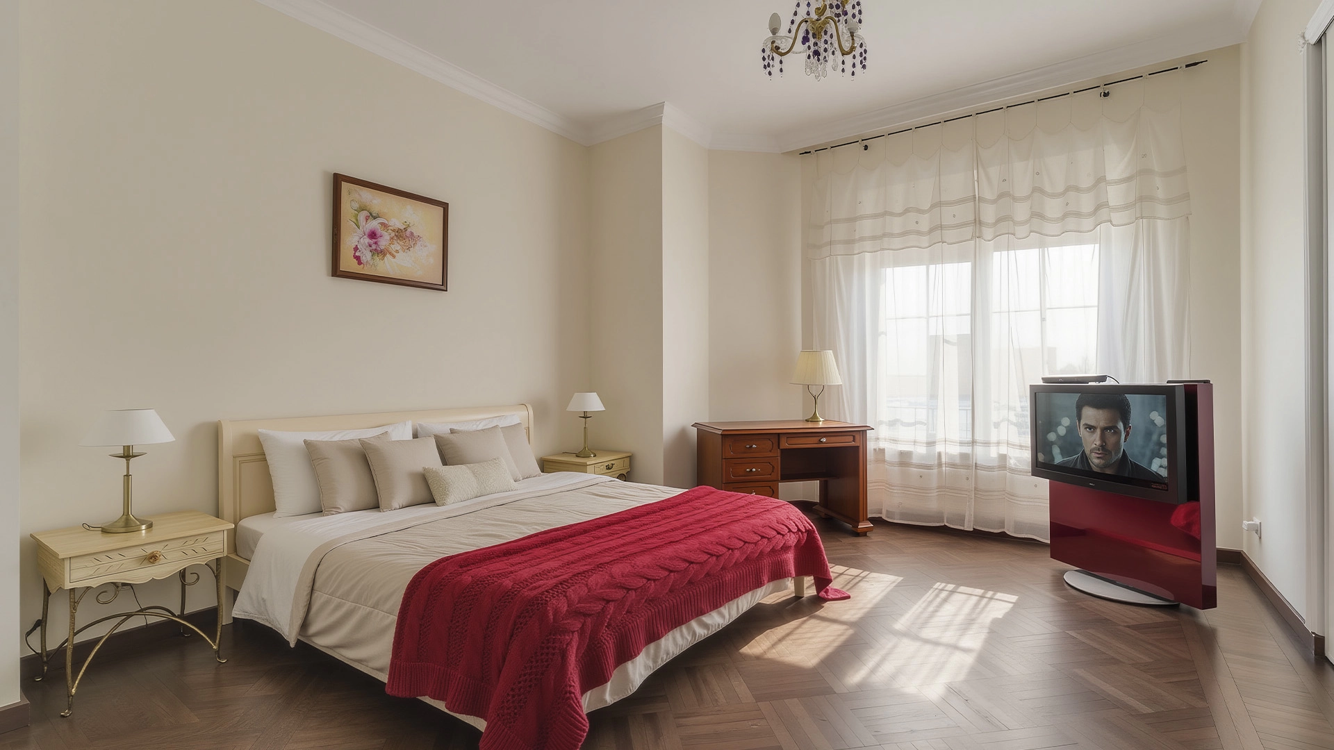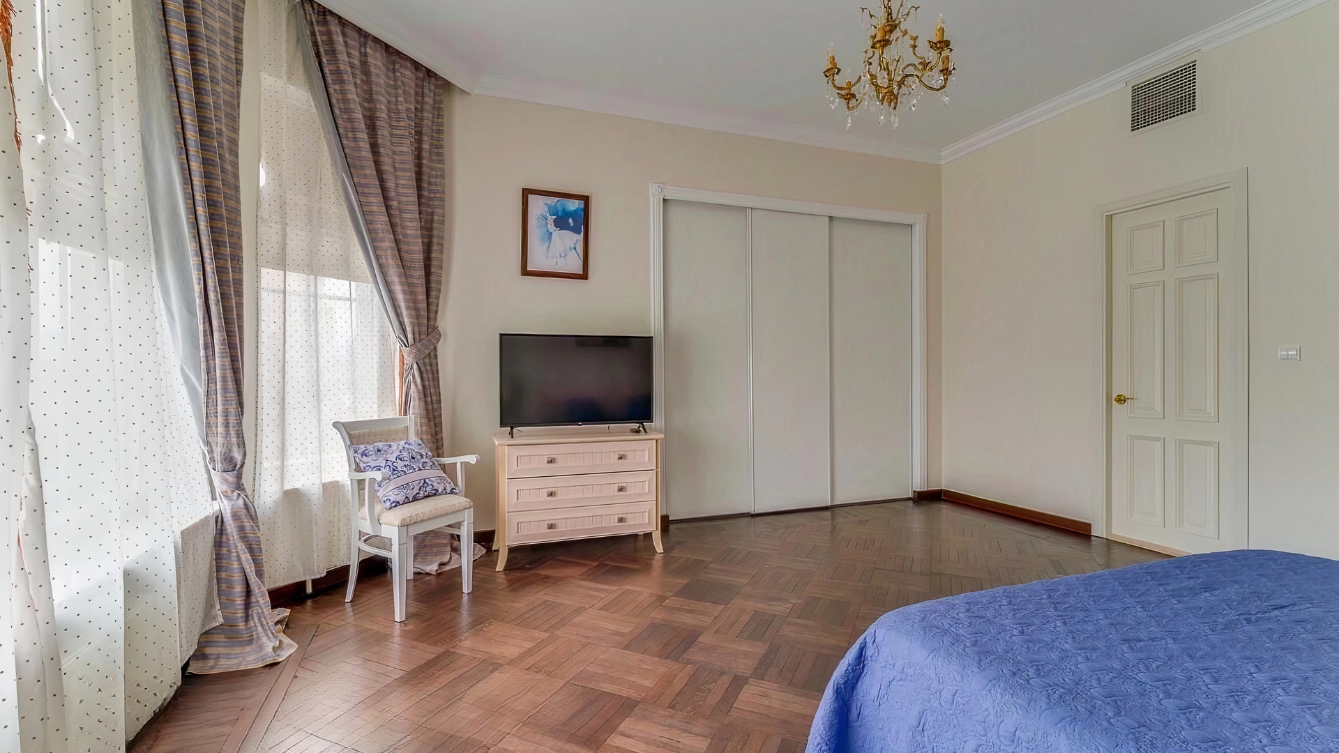 Видовая квартира с 2-мя спальнями общей площадью 150 м² в клубном комплексе «Агаларов Хаус». Выполнена светлая дизайнерская отделка в классическом стиле. Интерьер украшен картинами и подвесными люстрами. Распашные панорамные окна, потолки высотой 3,2 метра.