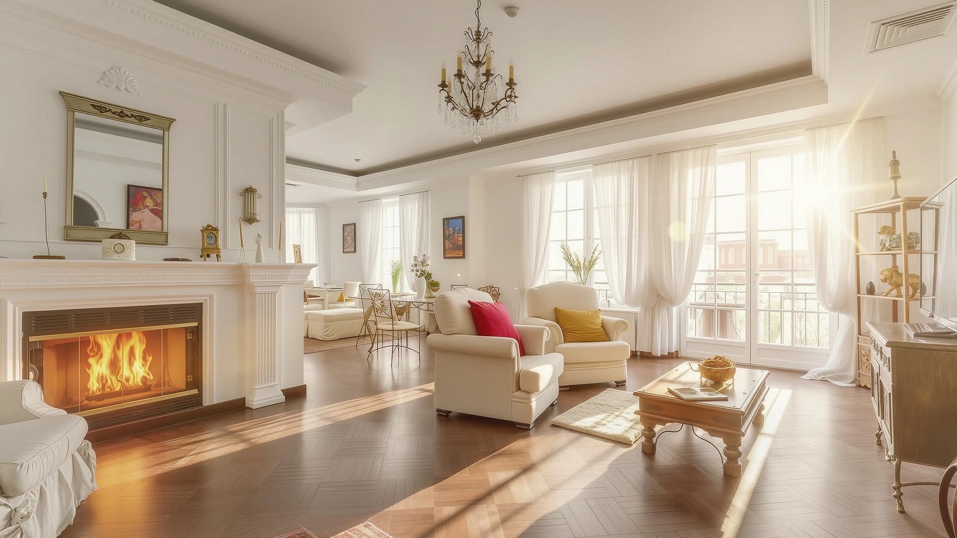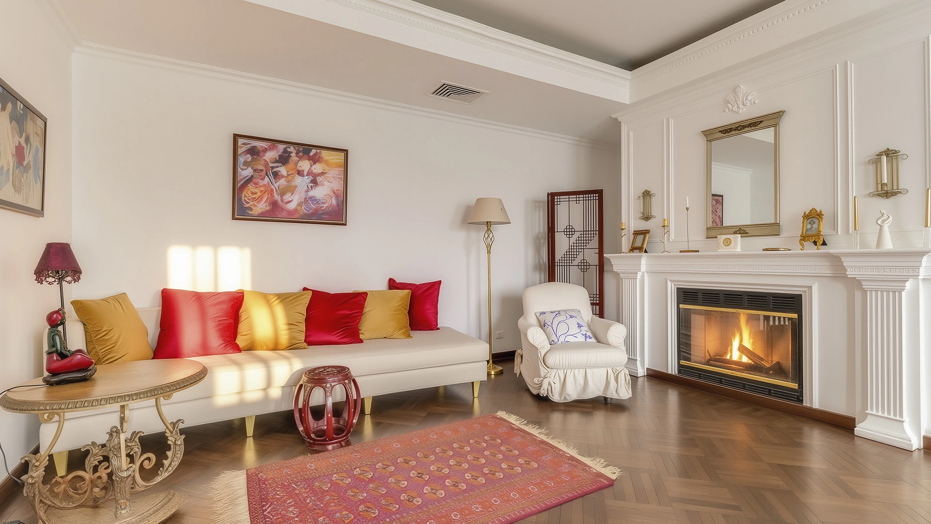 Видовая квартира в классическом стиле с камином и панорамным остеклением, 150 м²