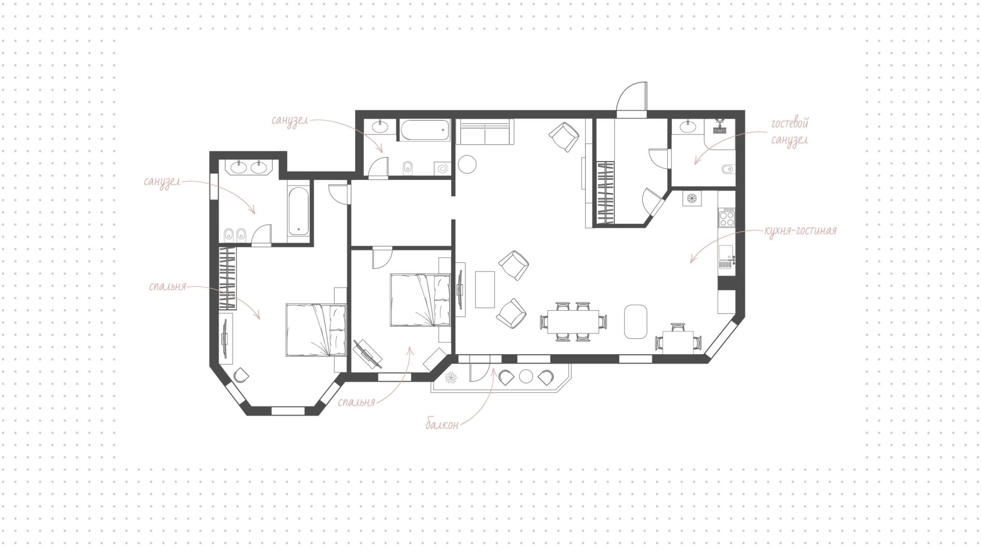 Планировка: гостиная-столовая с зоной кухни, две большие спальни, две ванные комнаты, гостевой санузел. Спланирован выход на большой открытый балкон с панорамным видом на город. Квартира полностью укомплектована мебелью и бытовой техникой. Одно машиноместо в подземном паркинге.