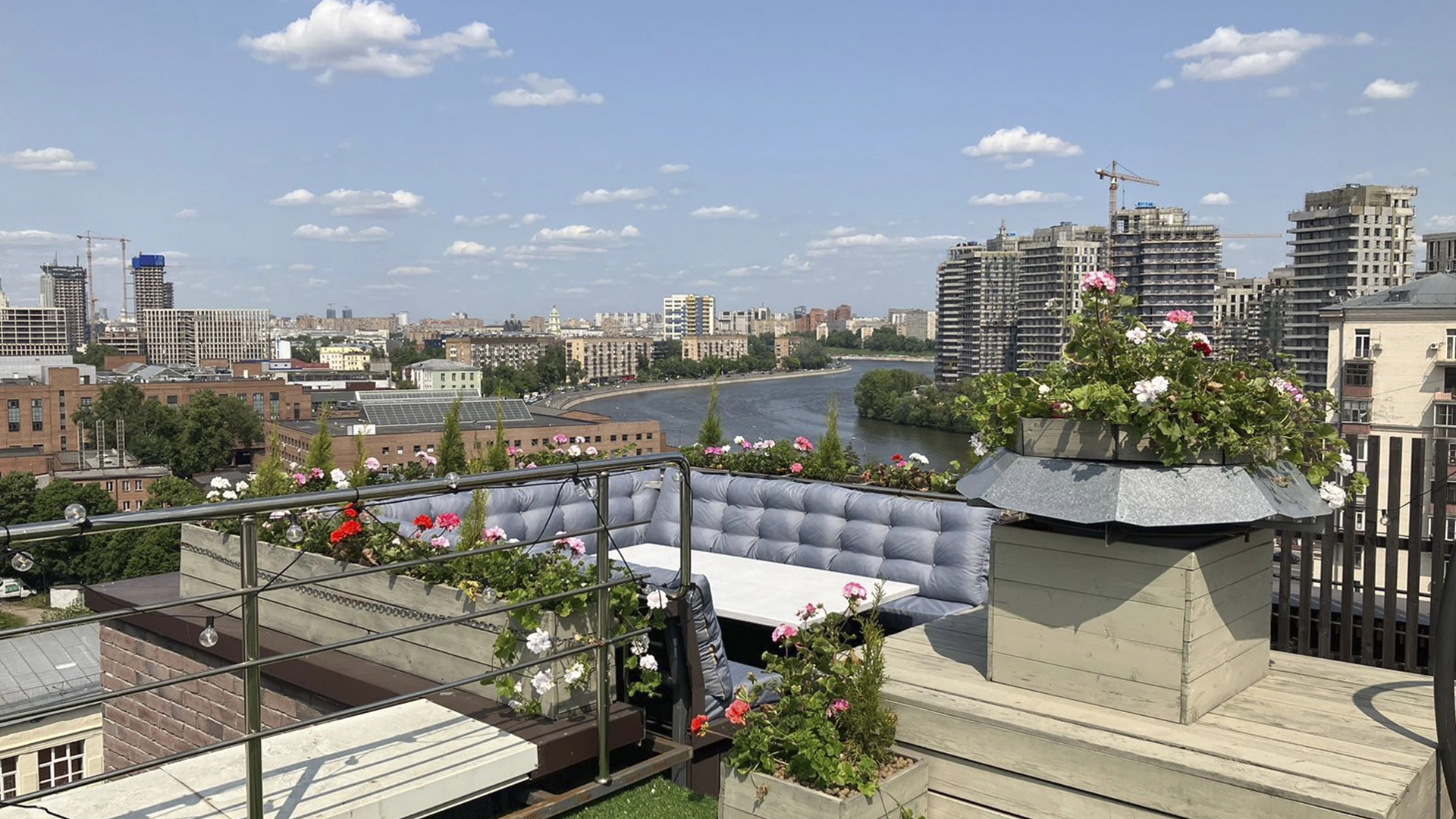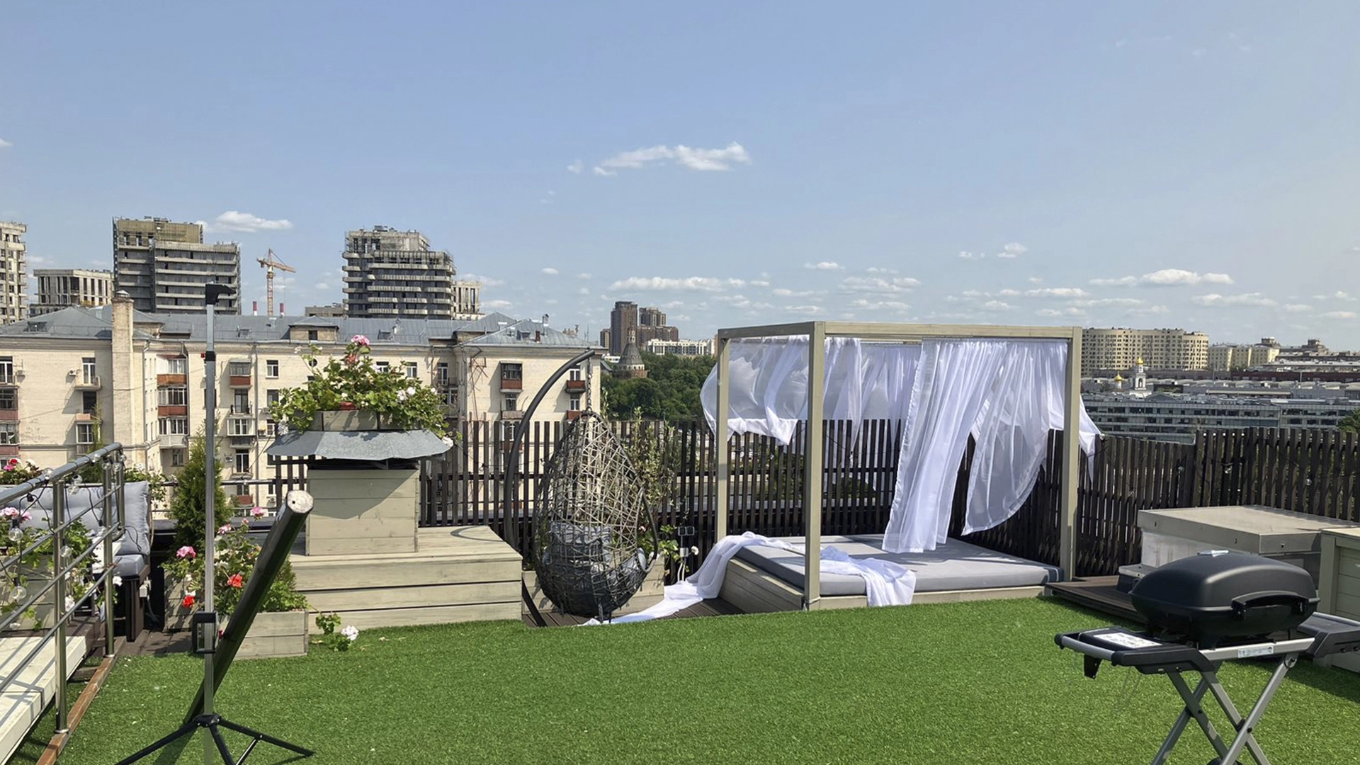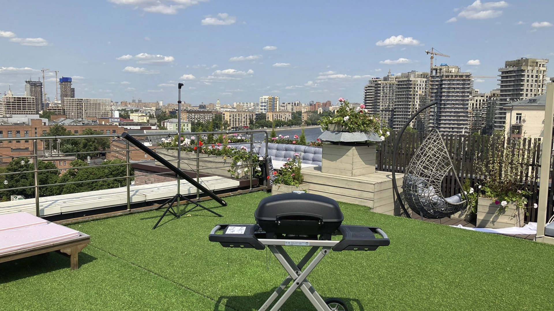На 1-м уровне обустроена уютная гостиная с кухонной и обеденной зоной, санузел, гардеробная, холл. На 2-м уровне — спальня, зона кабинета и ванная комната. Лофт полностью укомплектован мягкой мебелью, бытовой техникой премиум-класса и авторскими предметами интерьера. С террасы открываются панорамные виды на город и Москву-реку.