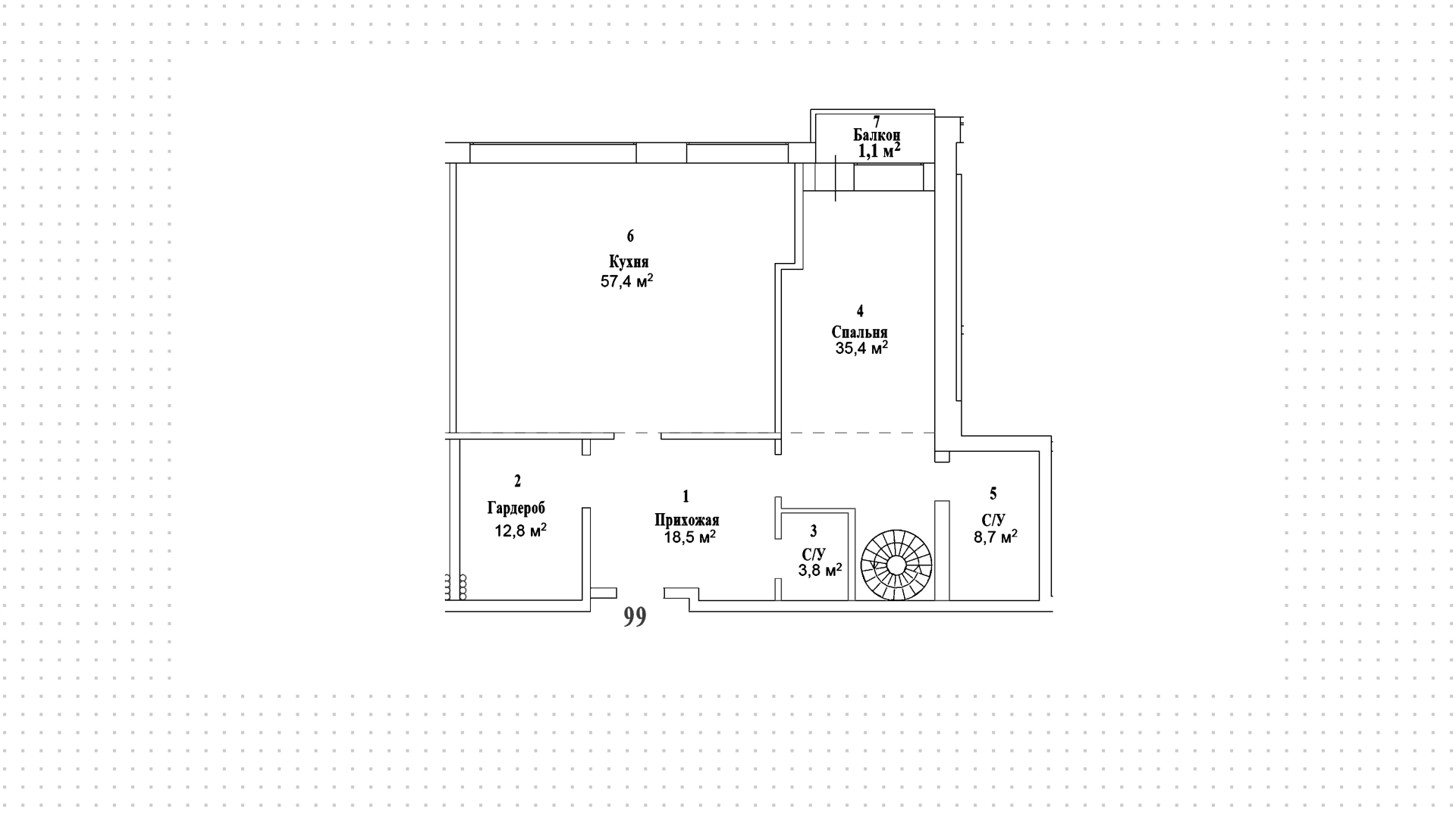 Двухуровневая квартира, общей площадью 187 м². Квартира продается без отделки, внутри просторный холл с гардеробной, гостевой санузел, большая кухня. На втором уровне — спальня с личной ванной комнатой и выходом на балкон.