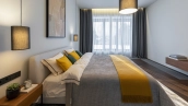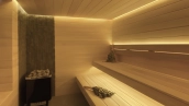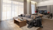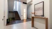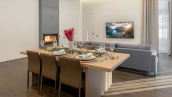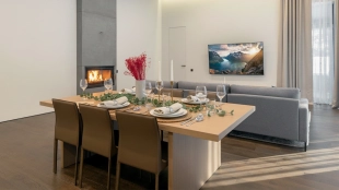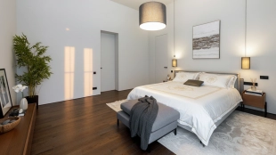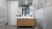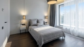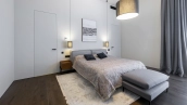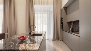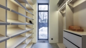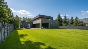 Загородный дом площадью 500 м² расположен на полевом участке 15 соток. Фасад здания с панорамными окнами выполнен в современном стиле, облицован темными панелями и декорирован вертикальными планками. В отделке лаконичного интерьера использованы слэбы из мрамора и гранита, на полу уложена инженерная дубовая доска. Коттедж частично укомплектован мебелью, установлена бытовая техника Miele. Планировка резиденции включает 5 спален, одна из которых с небольшой кухней для гостей, кухню-столовую-гостиную с камином и выходом на террасу, где расположен бассейн длиной 10 метров, сауну, хаммам и комнату для персонала. К дому пристроен навес на 2 машины. На участке с газоном можно выполнить ландшафтный дизайн и обустроить беседку с зоной барбекю.