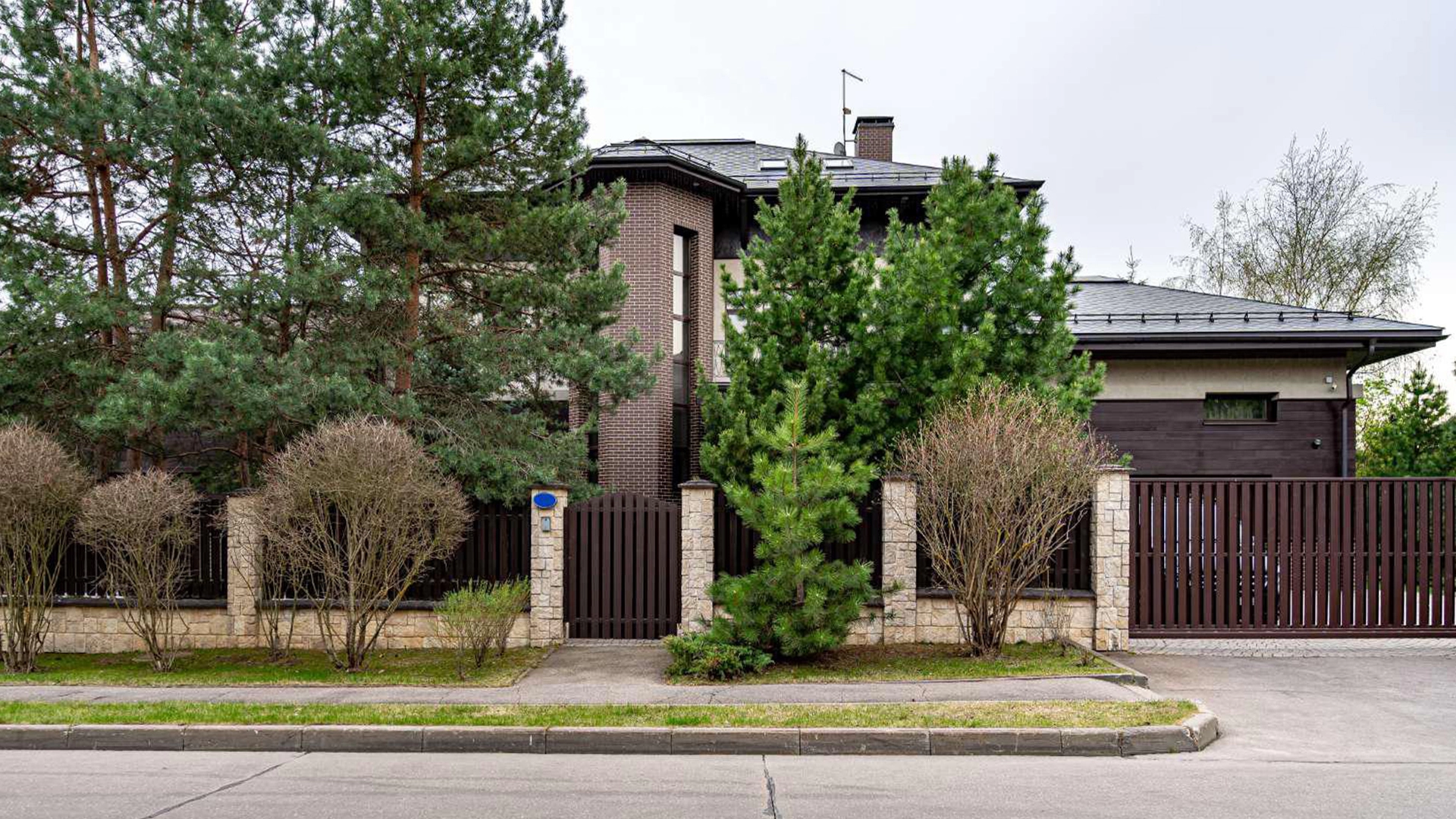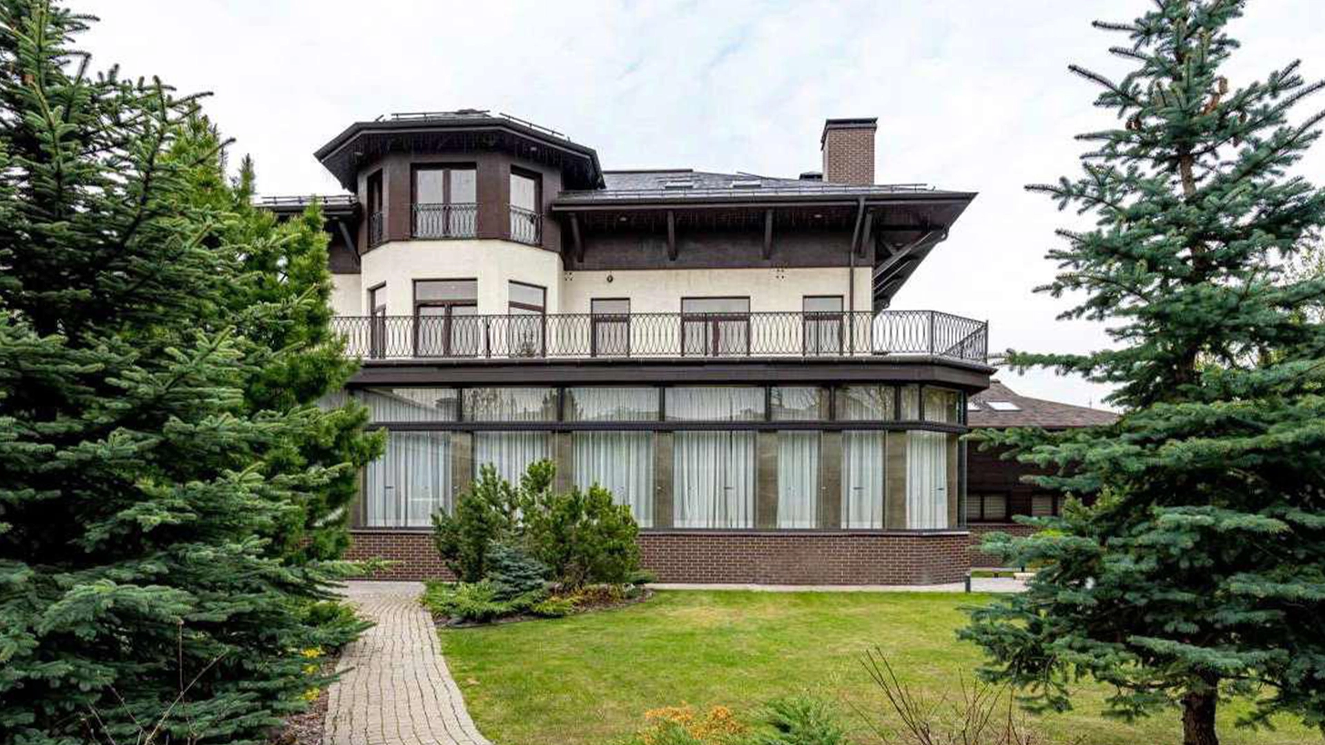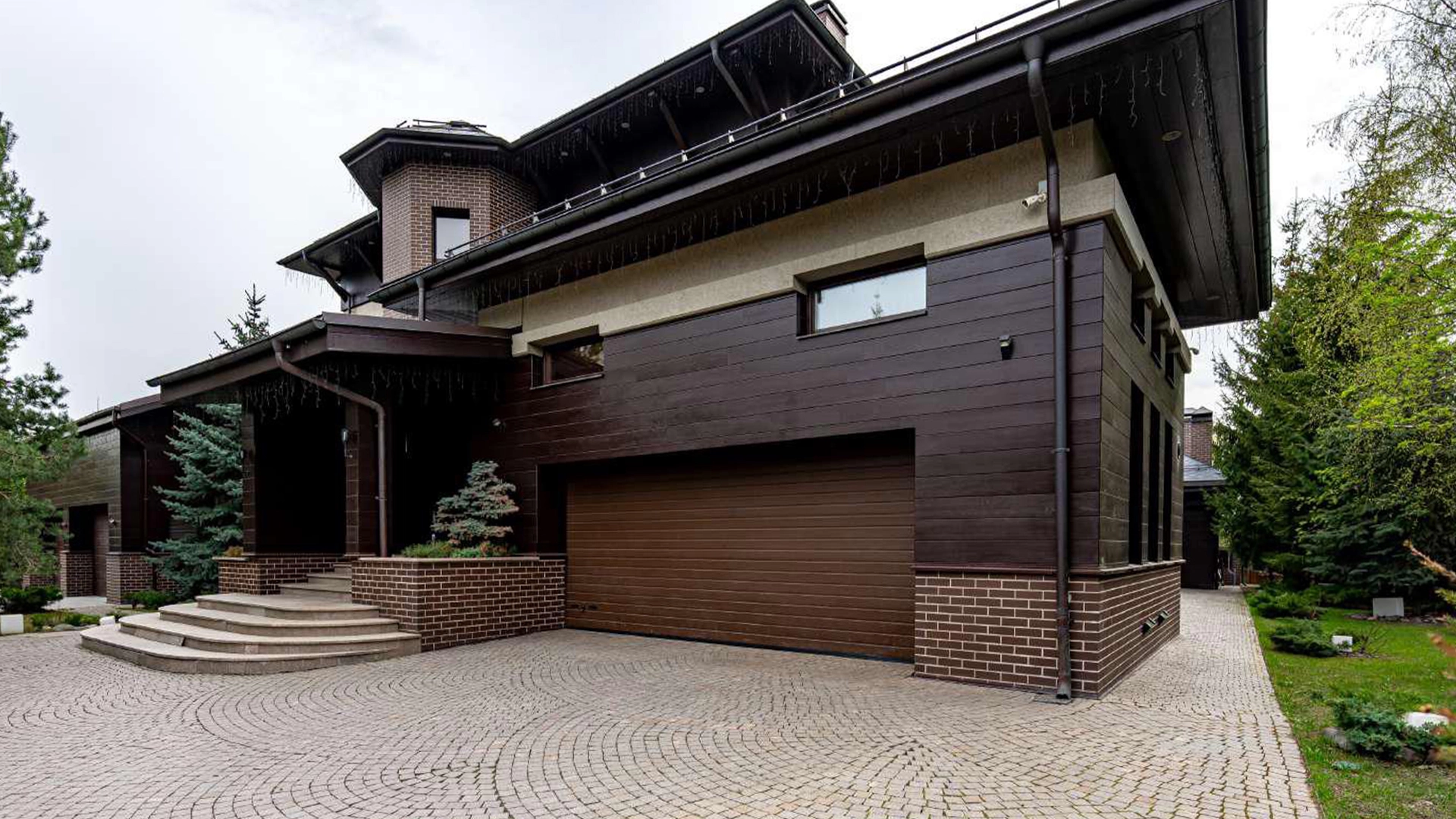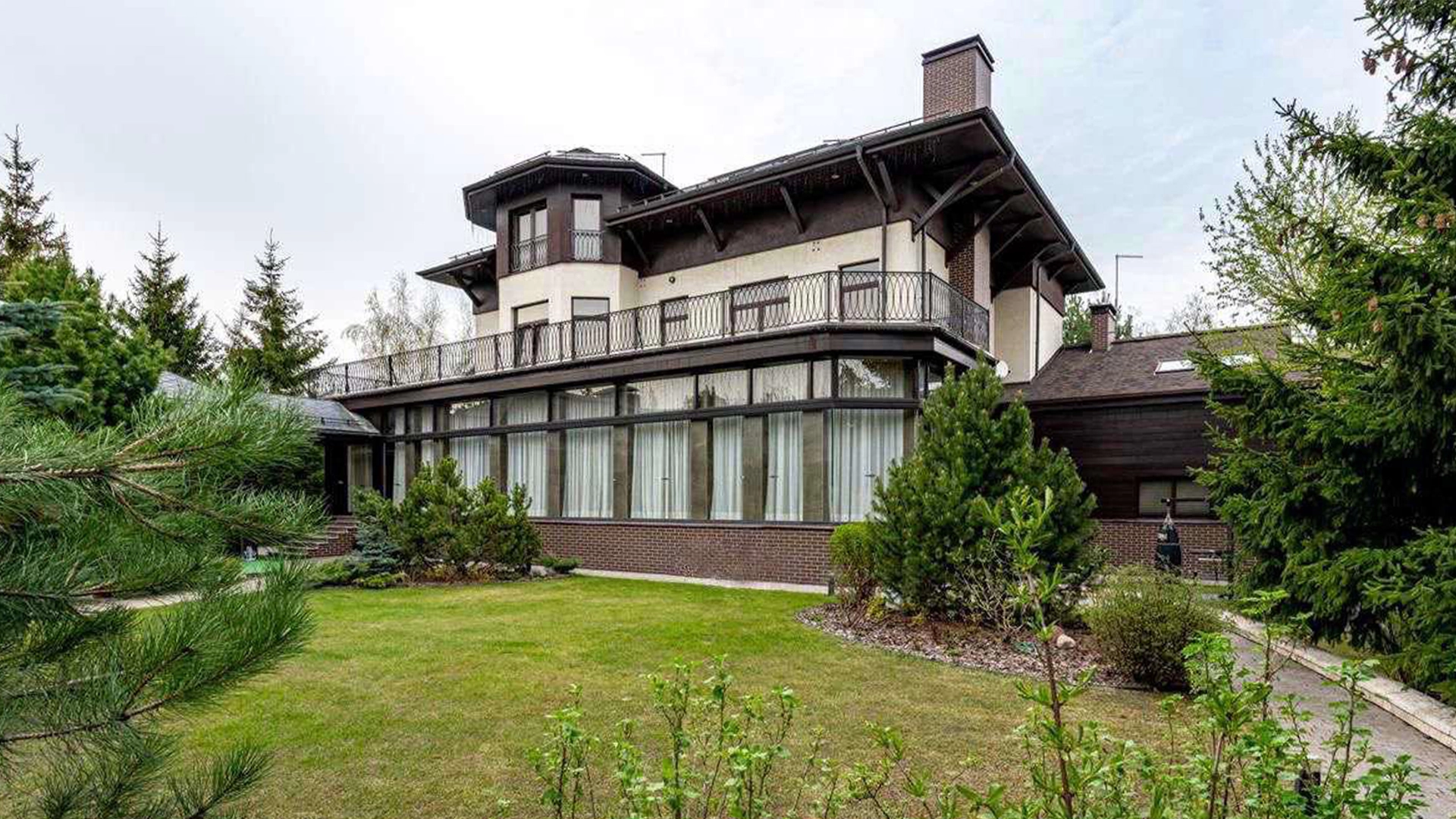 Загородный особняк площадью 1500 м² расположен на полевом участке 24 сотки рядом с парковой зоной. Современный фасад с выступающей крышей выполнен в бежево-коричневой гамме, облицован штукатуркой, кирпичом и панелями с фактурой дерева. Интерьер с элементами неоклассики выдержан спокойных, теплых тонах, укомплектован мебелью, бытовой техникой и сантехникой от ведущих мировых производителей. На полах выложен паркет из натуральной древесины.