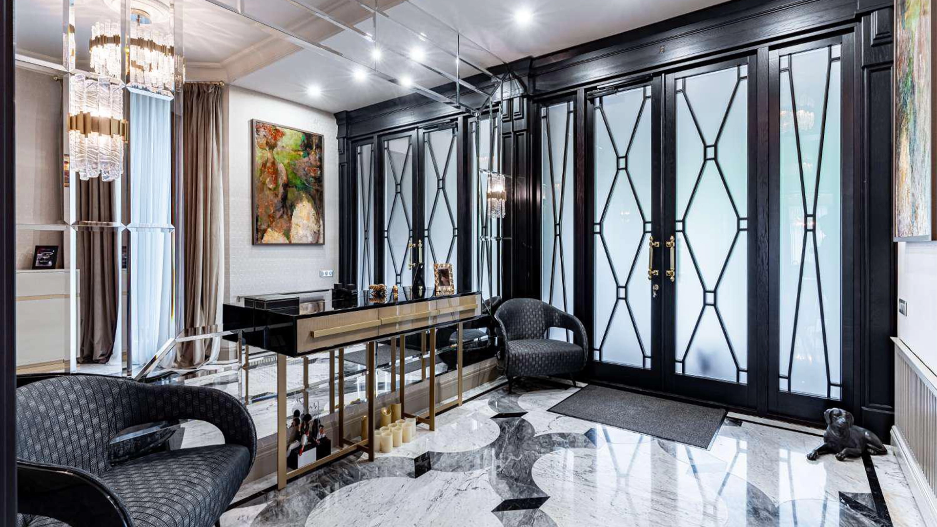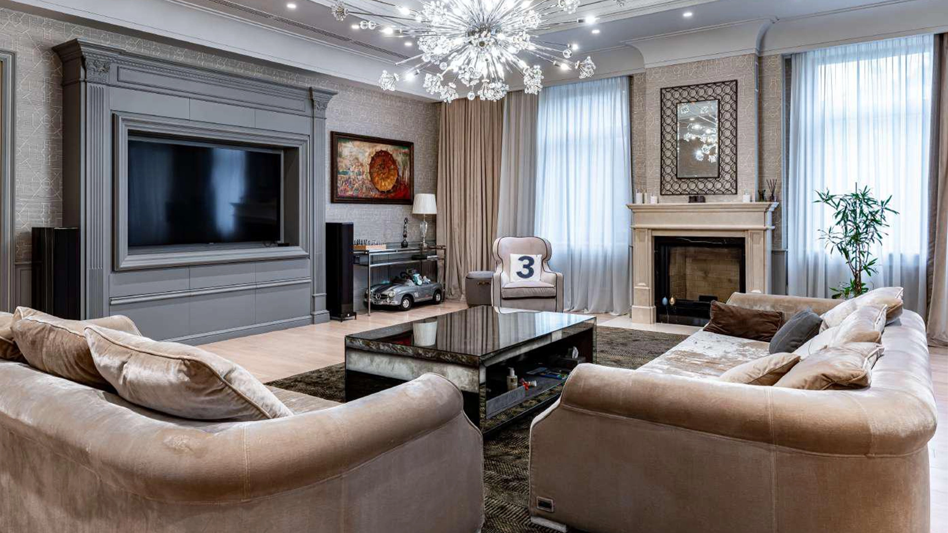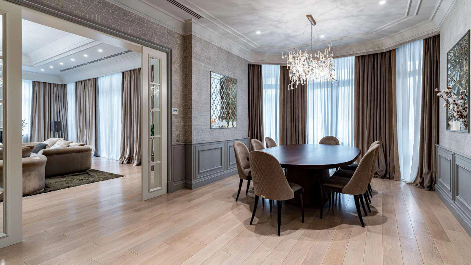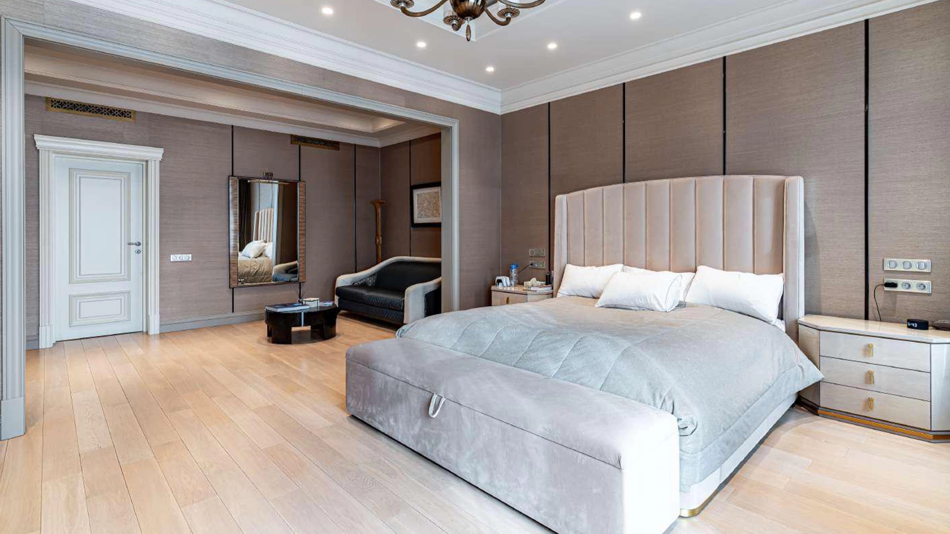 Загородный особняк площадью 1500 м² расположен на полевом участке 24 сотки рядом с парковой зоной. Современный фасад с выступающей крышей выполнен в бежево-коричневой гамме, облицован штукатуркой, кирпичом и панелями с фактурой дерева. Интерьер с элементами неоклассики выдержан спокойных, теплых тонах, укомплектован мебелью, бытовой техникой и сантехникой от ведущих мировых производителей. На полах выложен паркет из натуральной древесины.