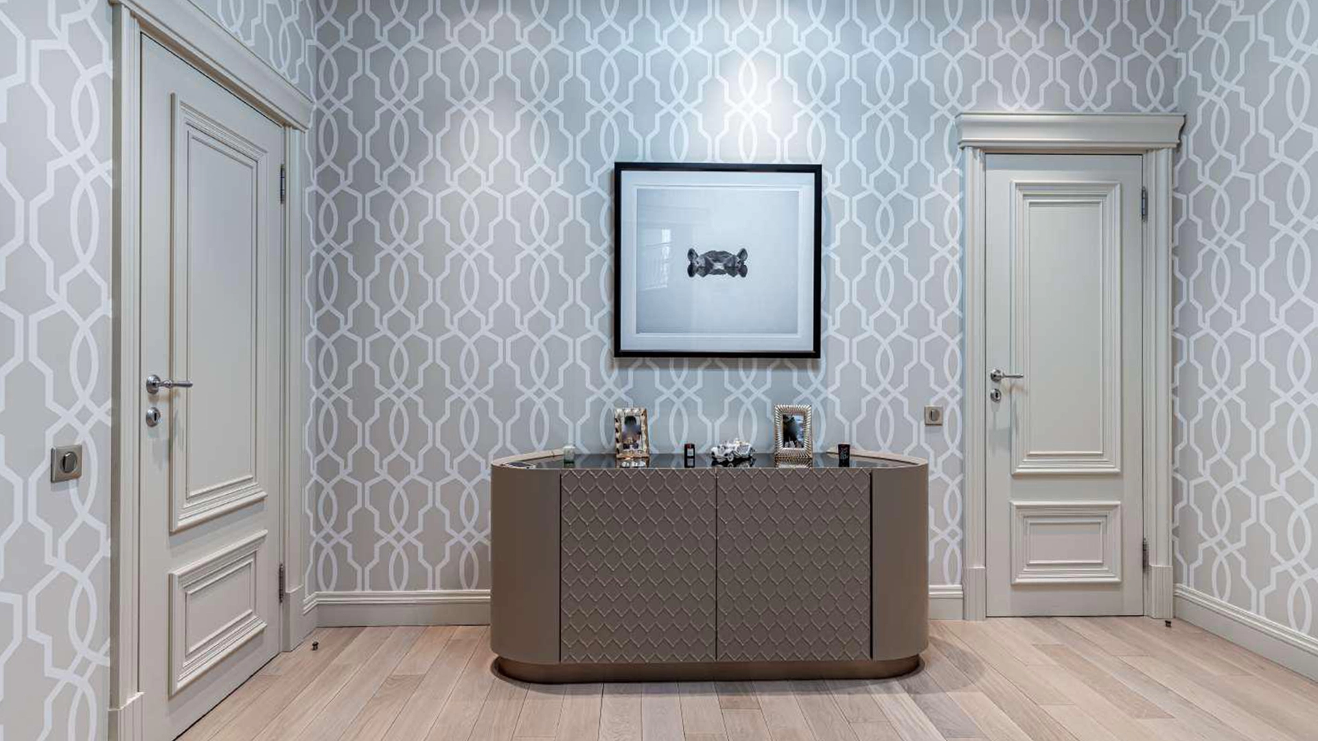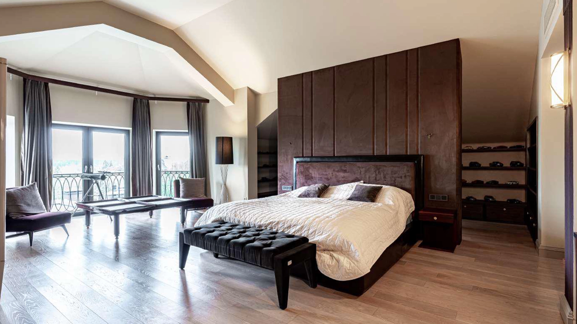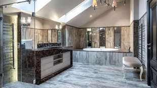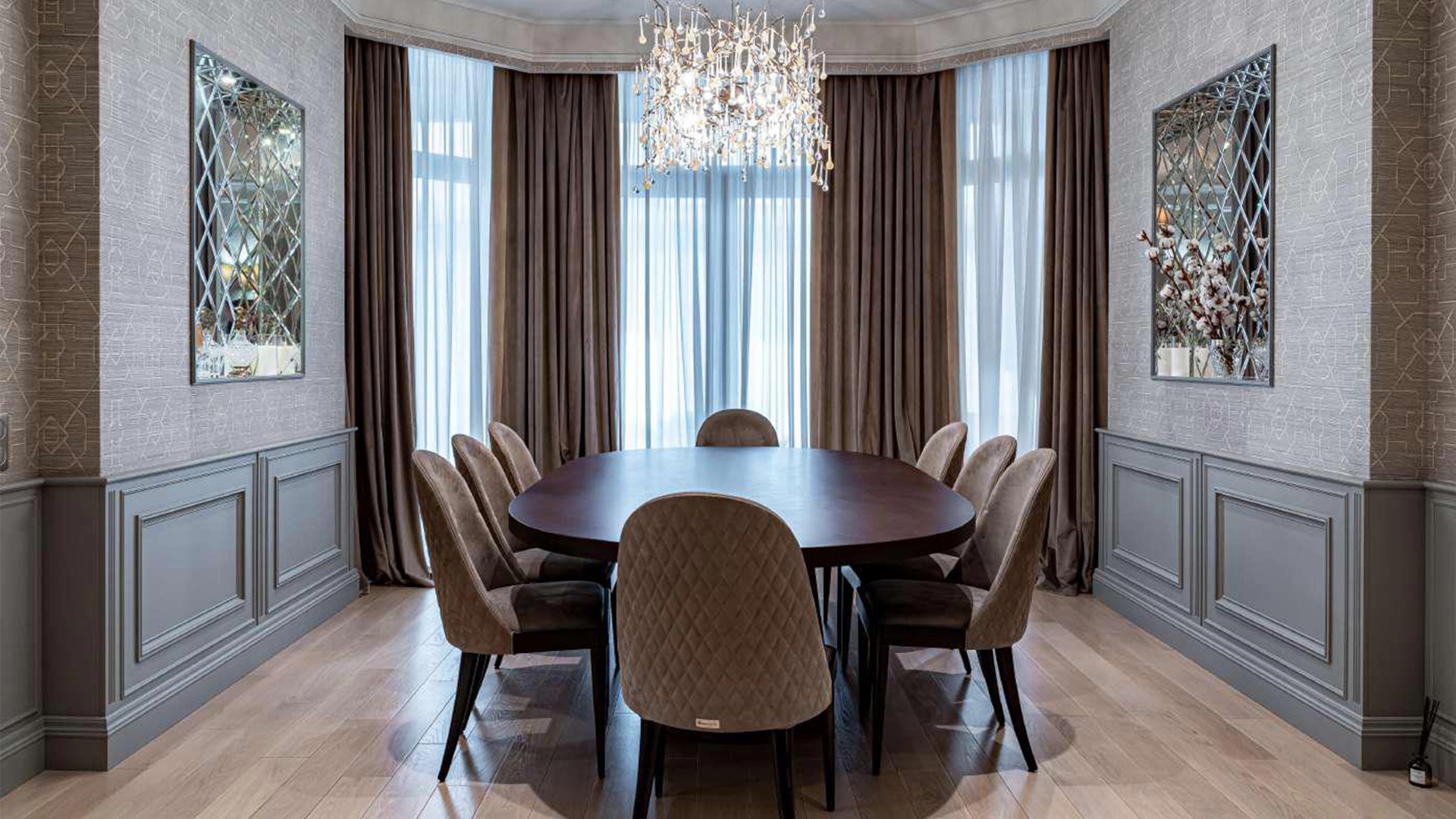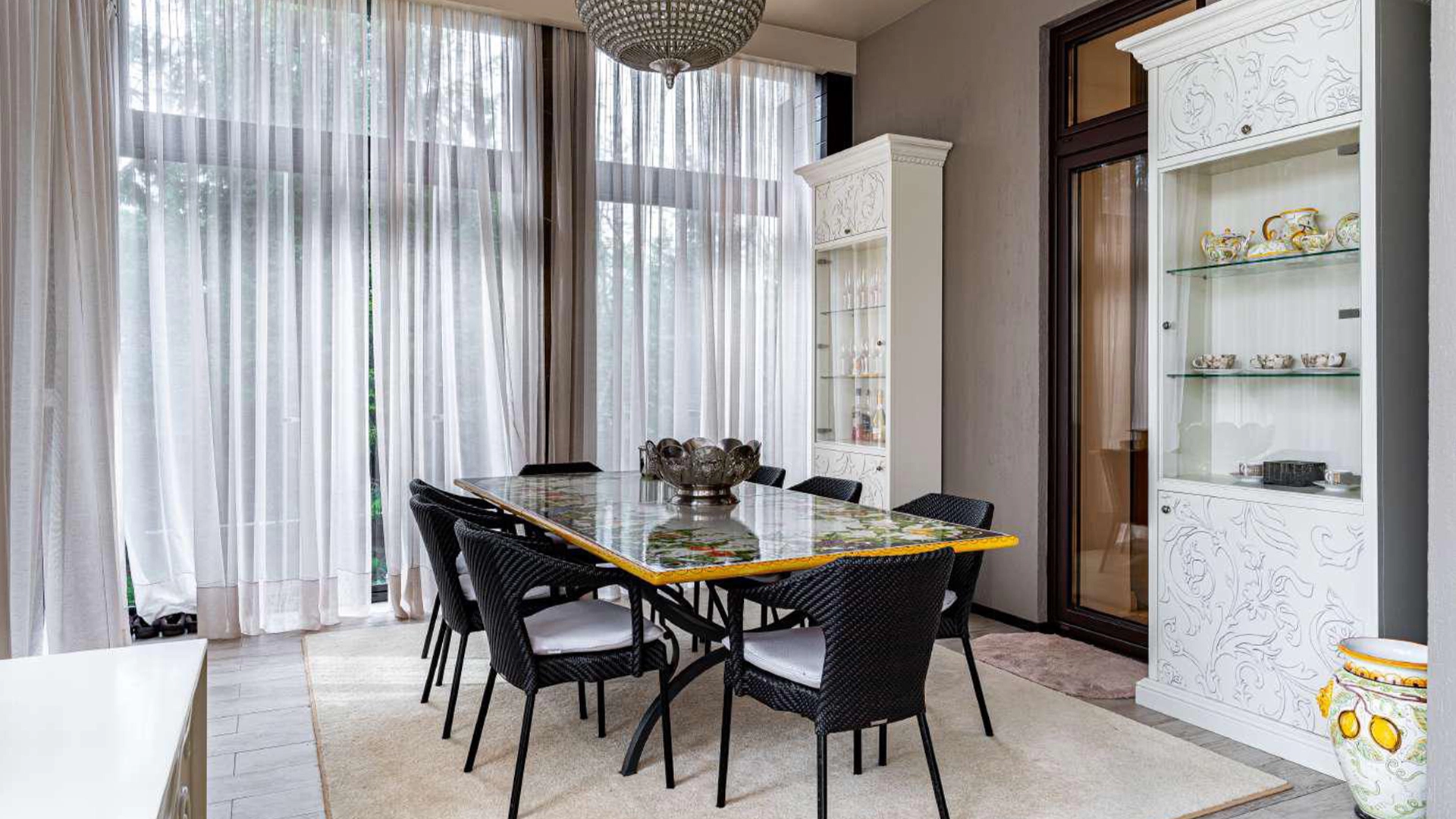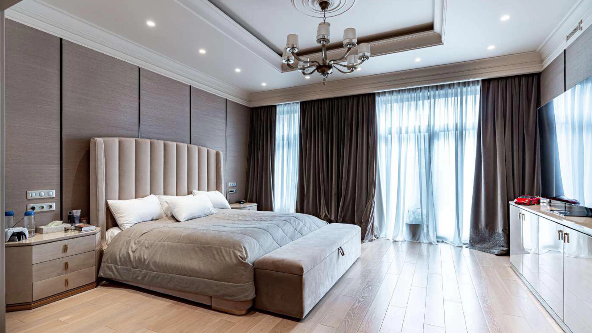 Загородный особняк площадью 1500 м² расположен на полевом участке 24 сотки рядом с парковой зоной. Современный фасад с выступающей крышей выполнен в бежево-коричневой гамме, облицован штукатуркой, кирпичом и панелями с фактурой дерева. Интерьер с элементами неоклассики выдержан спокойных, теплых тонах, укомплектован мебелью, бытовой техникой и сантехникой от ведущих мировых производителей. На полах выложен паркет из натуральной древесины.