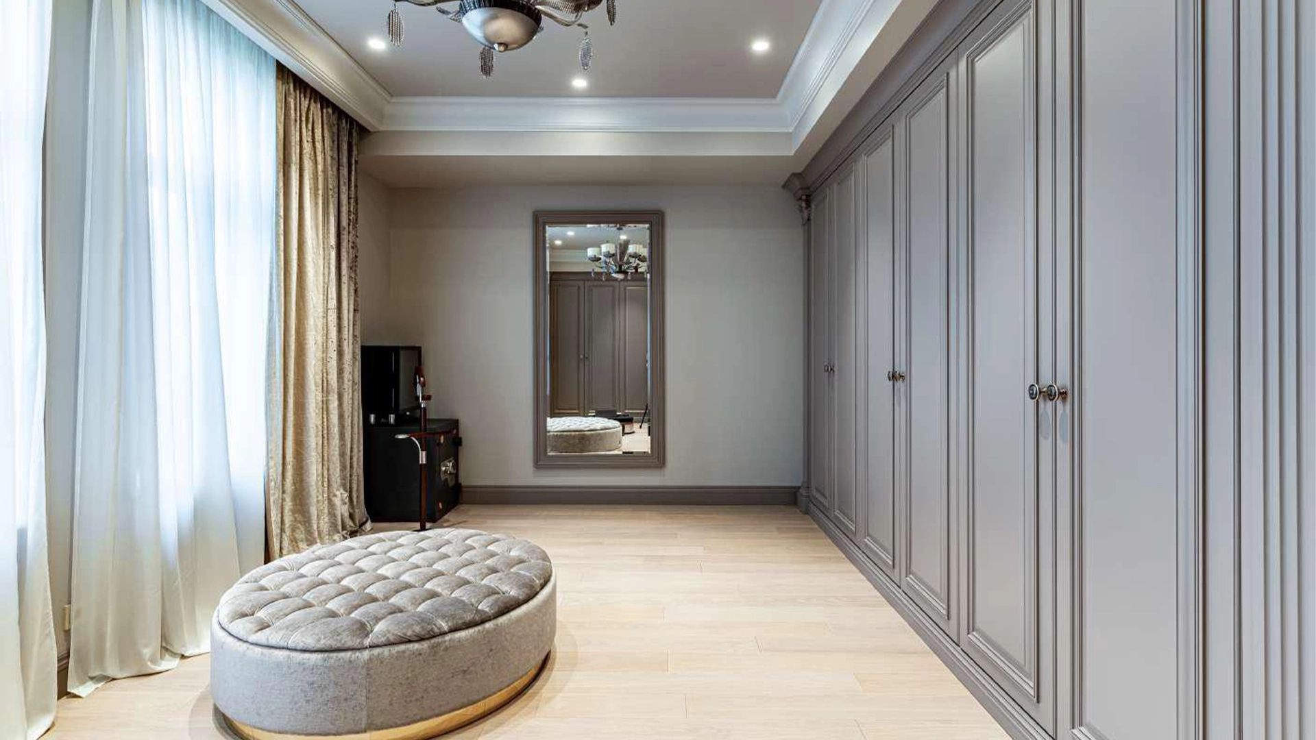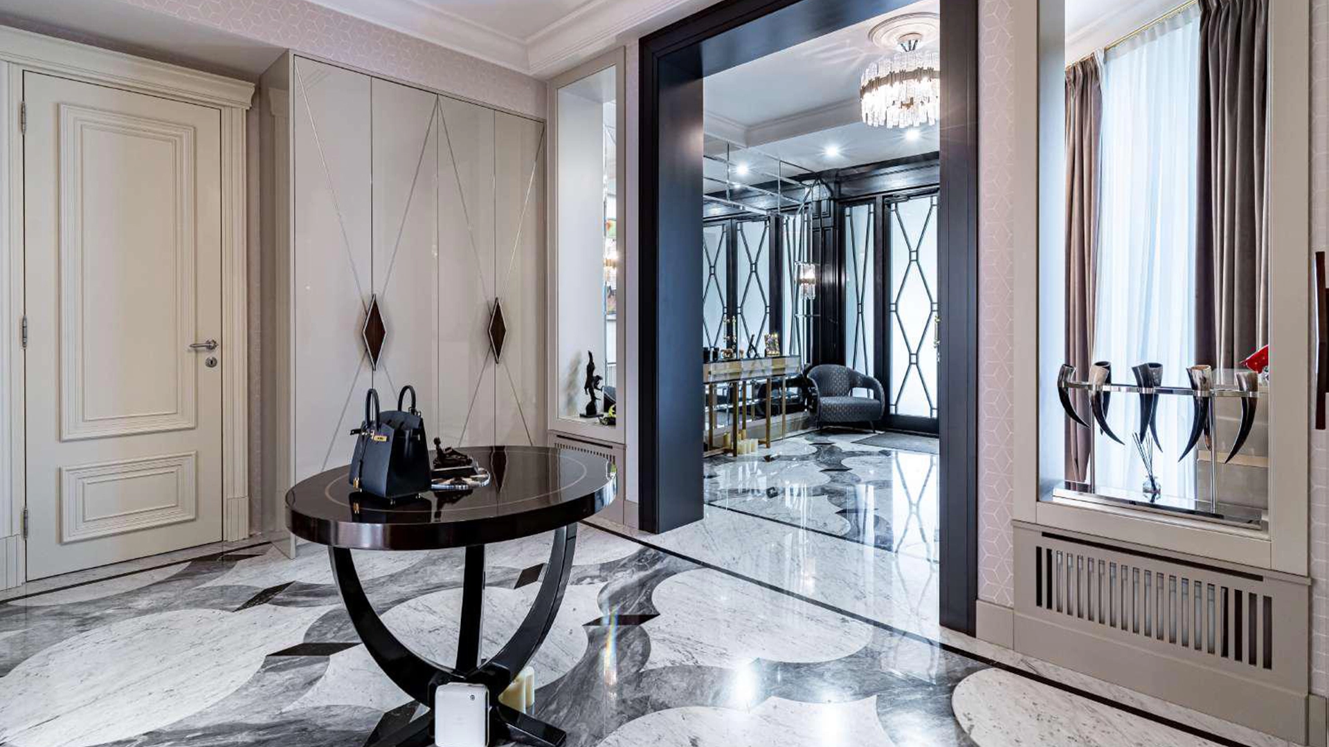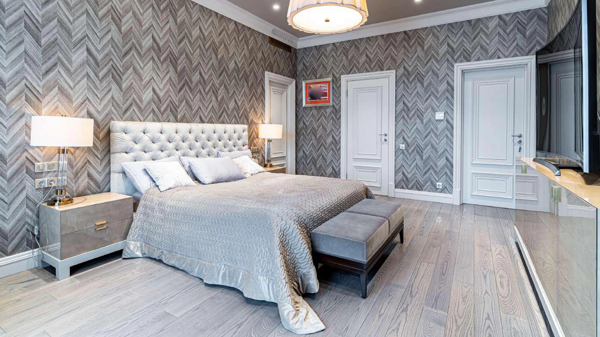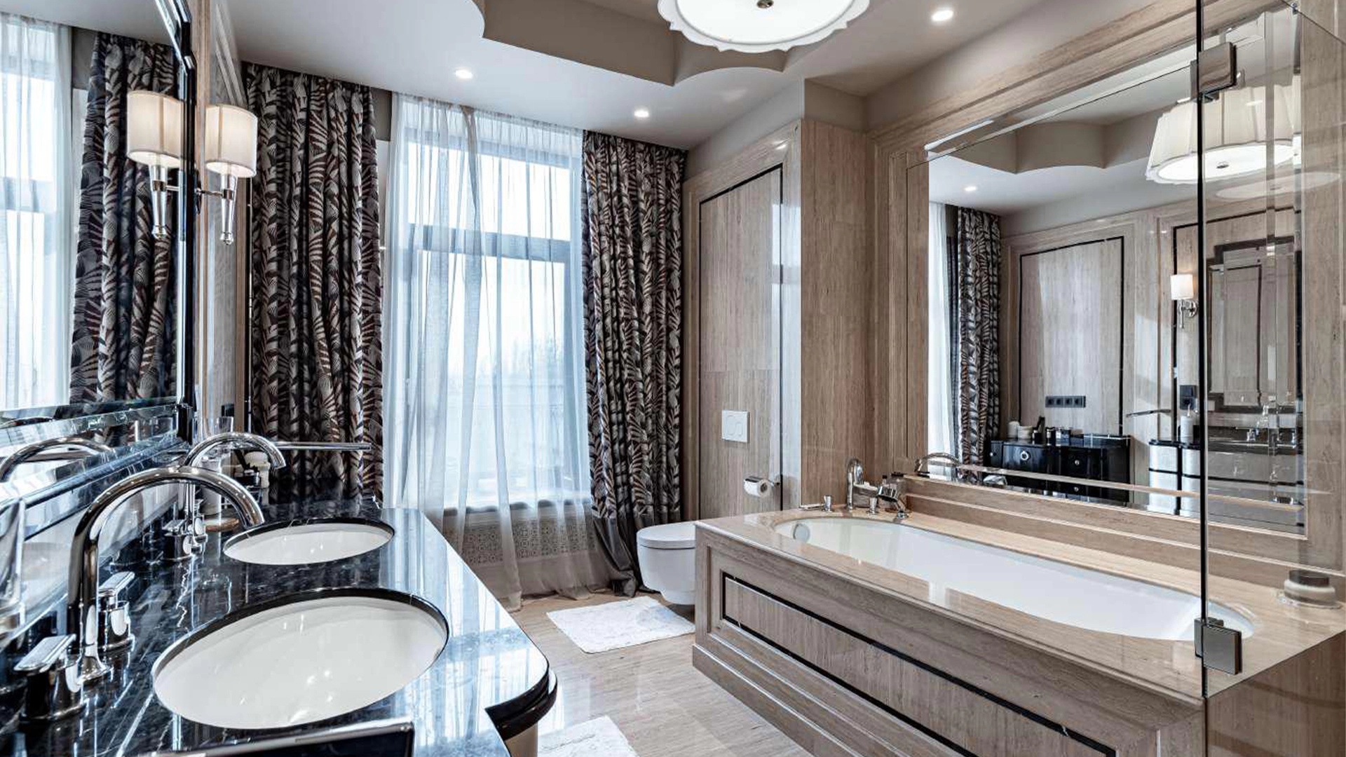 Загородный особняк площадью 1500 м² расположен на полевом участке 24 сотки рядом с парковой зоной. Современный фасад с выступающей крышей выполнен в бежево-коричневой гамме, облицован штукатуркой, кирпичом и панелями с фактурой дерева. Интерьер с элементами неоклассики выдержан спокойных, теплых тонах, укомплектован мебелью, бытовой техникой и сантехникой от ведущих мировых производителей. На полах выложен паркет из натуральной древесины.