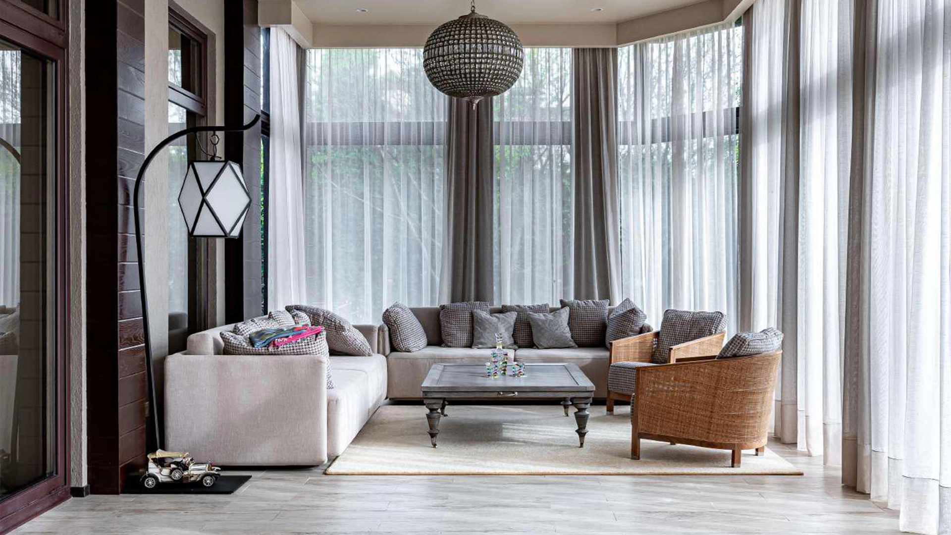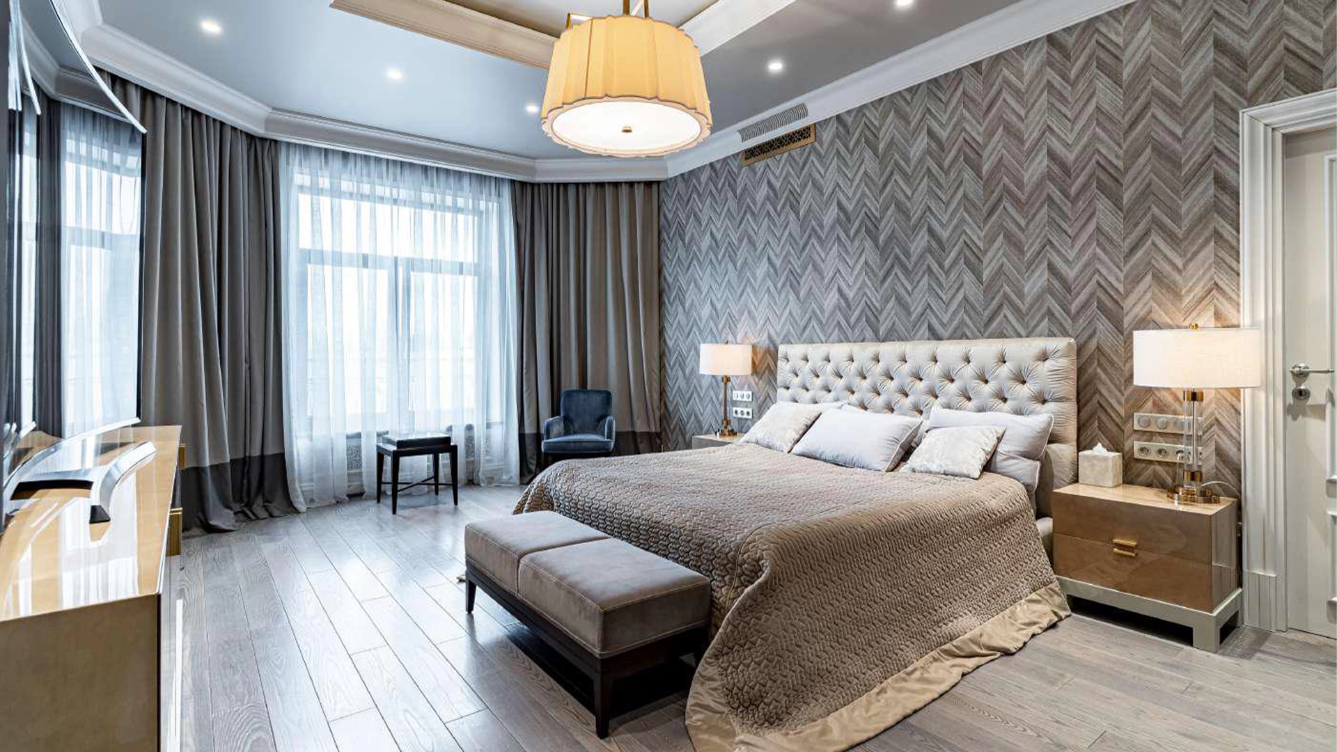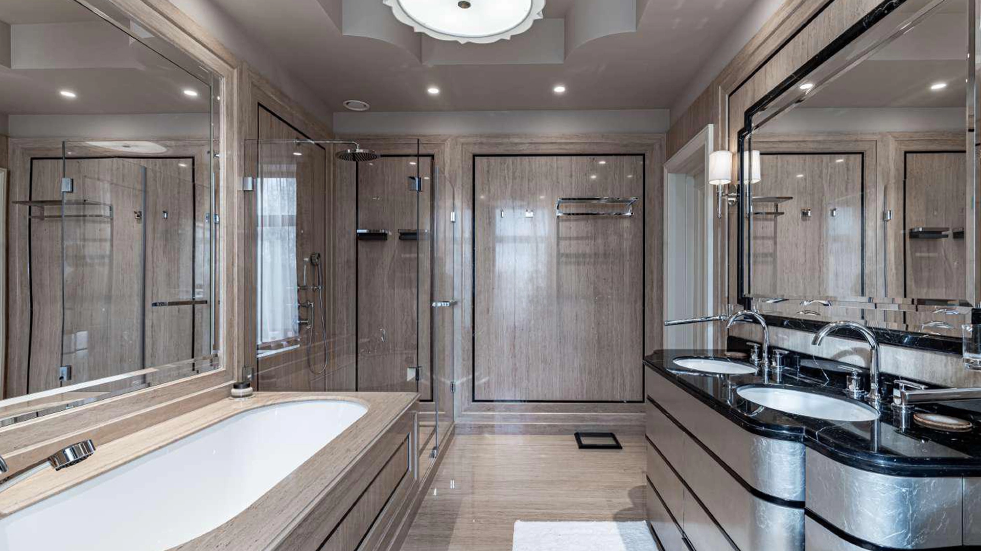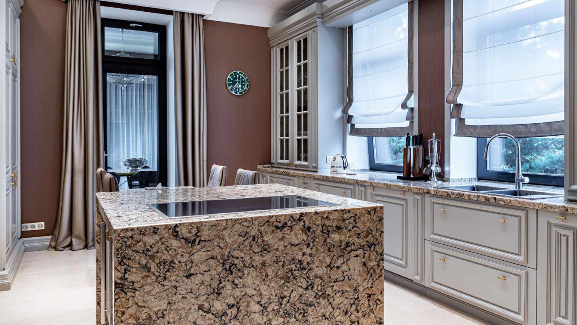 Загородный особняк площадью 1500 м² расположен на полевом участке 24 сотки рядом с парковой зоной. Современный фасад с выступающей крышей выполнен в бежево-коричневой гамме, облицован штукатуркой, кирпичом и панелями с фактурой дерева. Интерьер с элементами неоклассики выдержан спокойных, теплых тонах, укомплектован мебелью, бытовой техникой и сантехникой от ведущих мировых производителей. На полах выложен паркет из натуральной древесины.