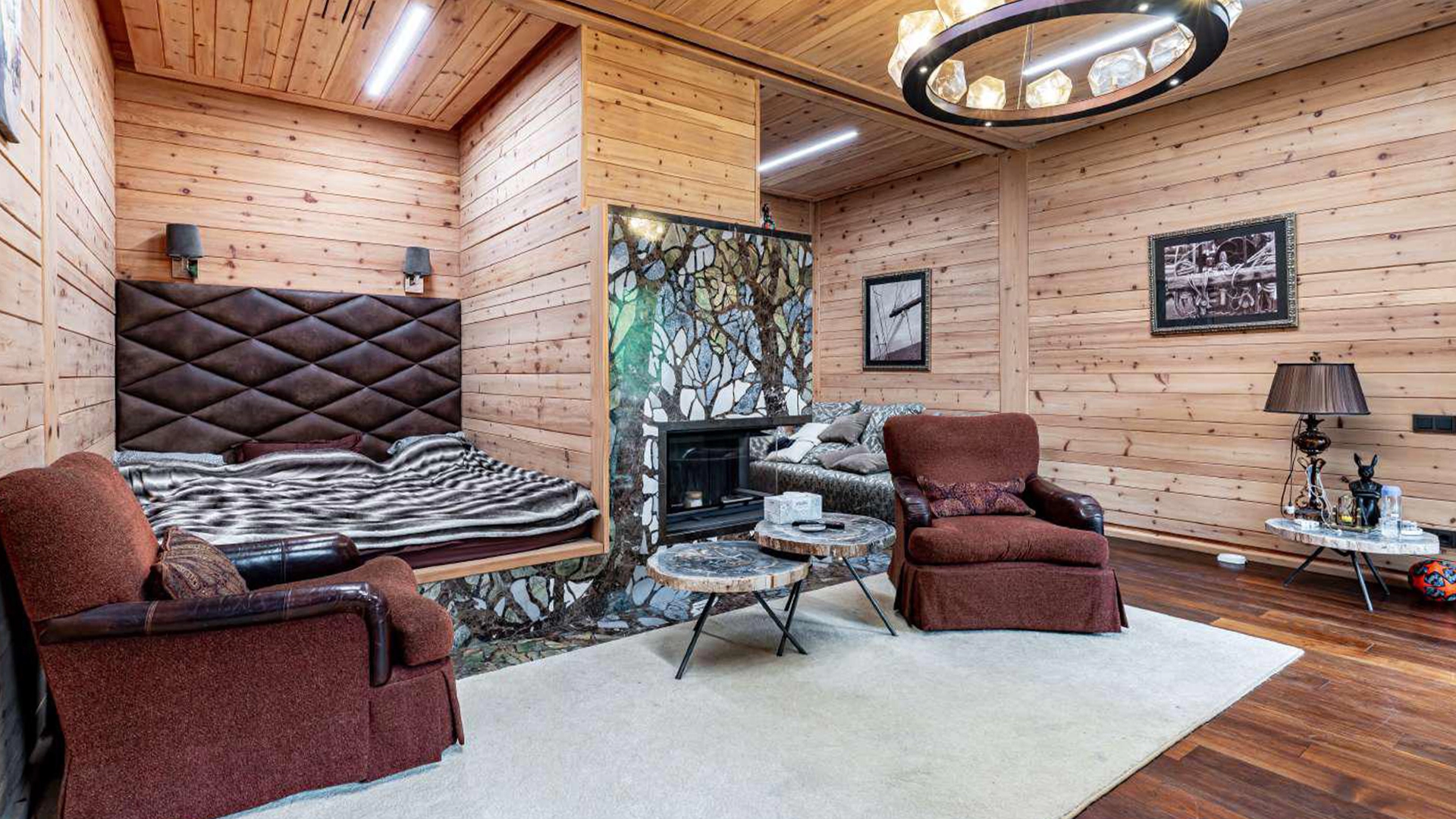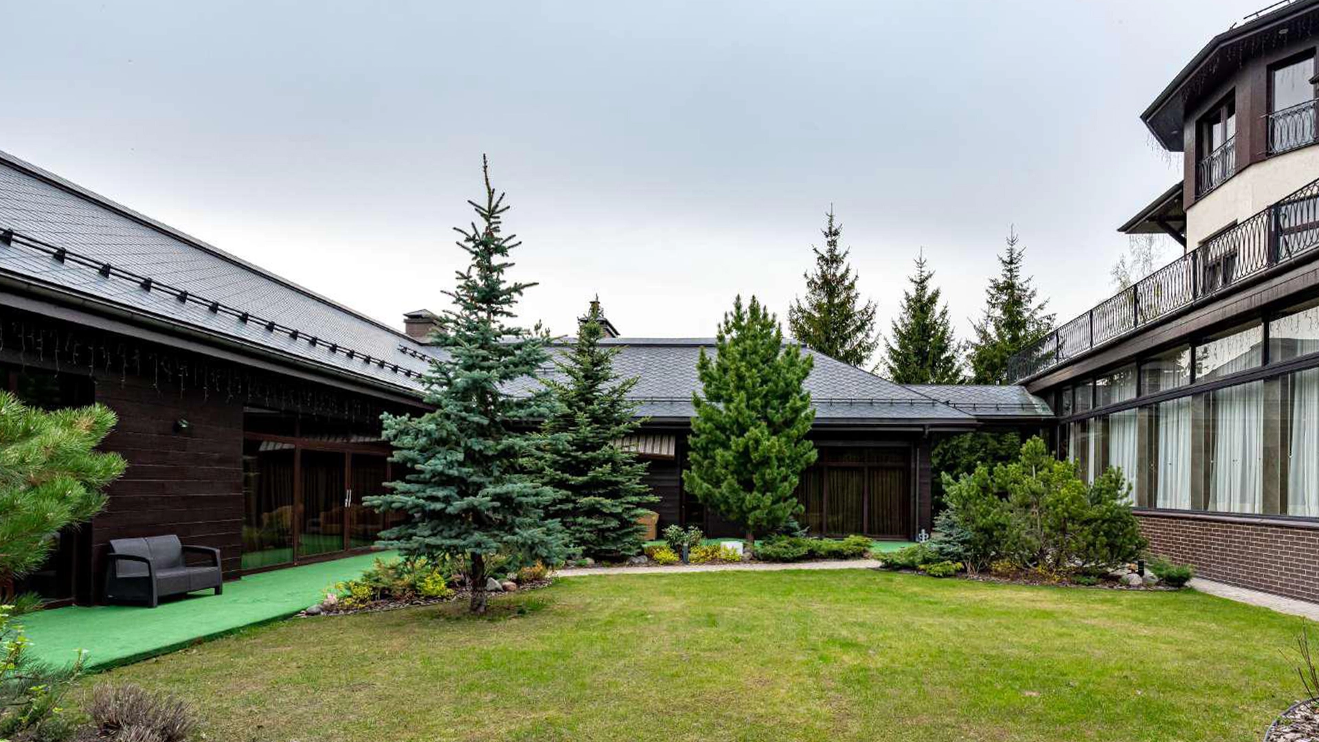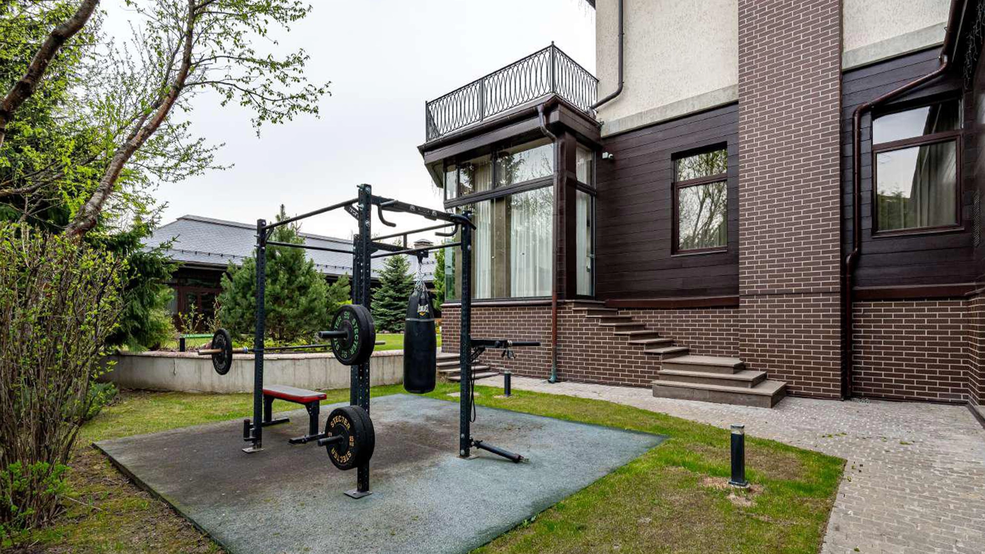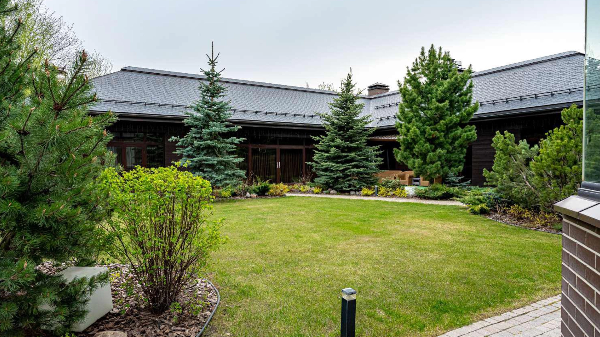 Для дополнительного комфорта оборудована система приточно-вытяжной вентиляции с кондиционированием. Планировка четырехуровневой резиденции включает просторную гостиную с камином и выходом на крытую летнюю террасу, кухню-столовую, 5 спален, кабинет, игровую, домашний кинотеатр, оружейную комнату и несколько гардеробных. Также в контуре дома находятся блок для персонала и 2 гаража, рассчитанные на 6 машин.