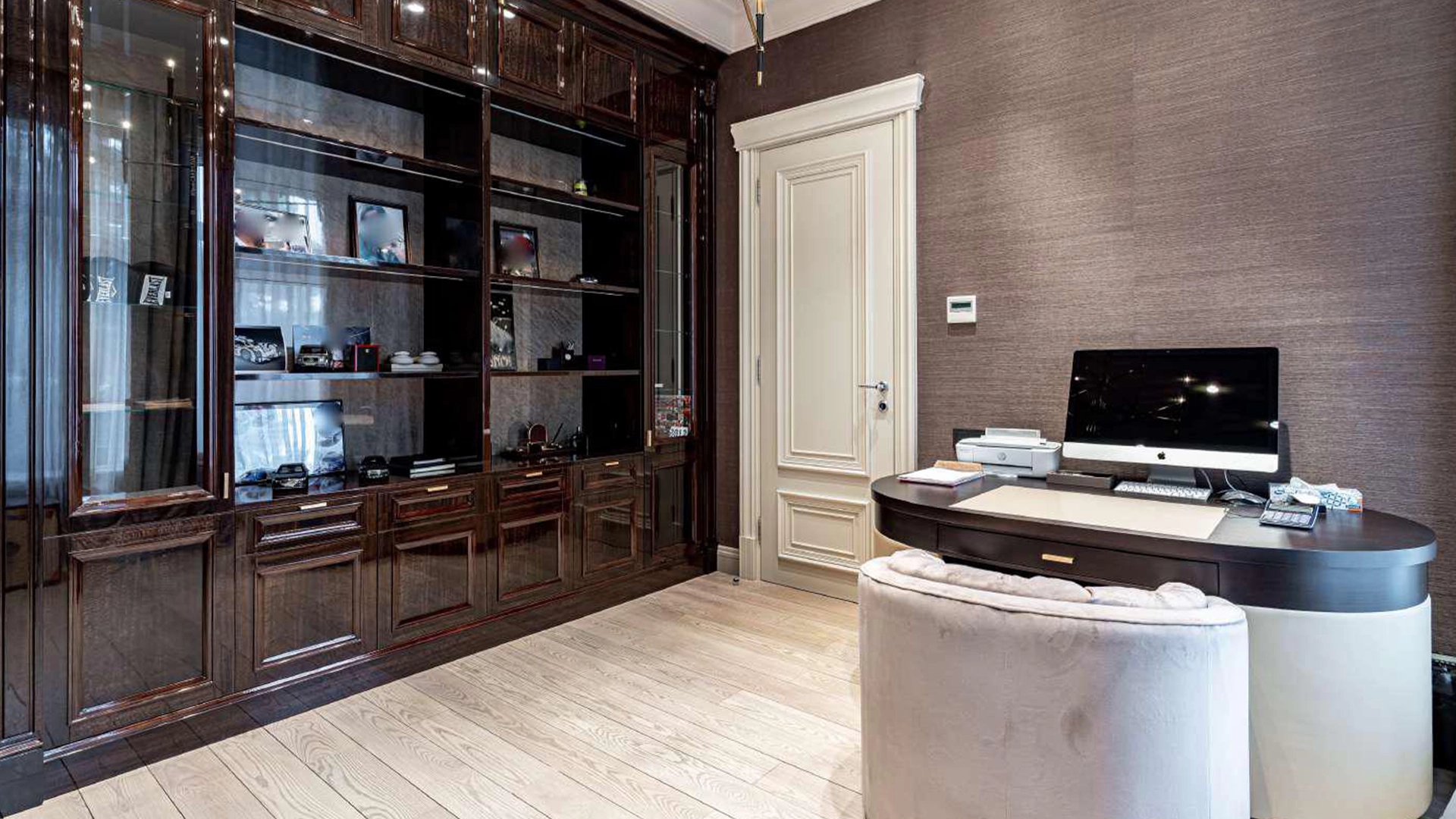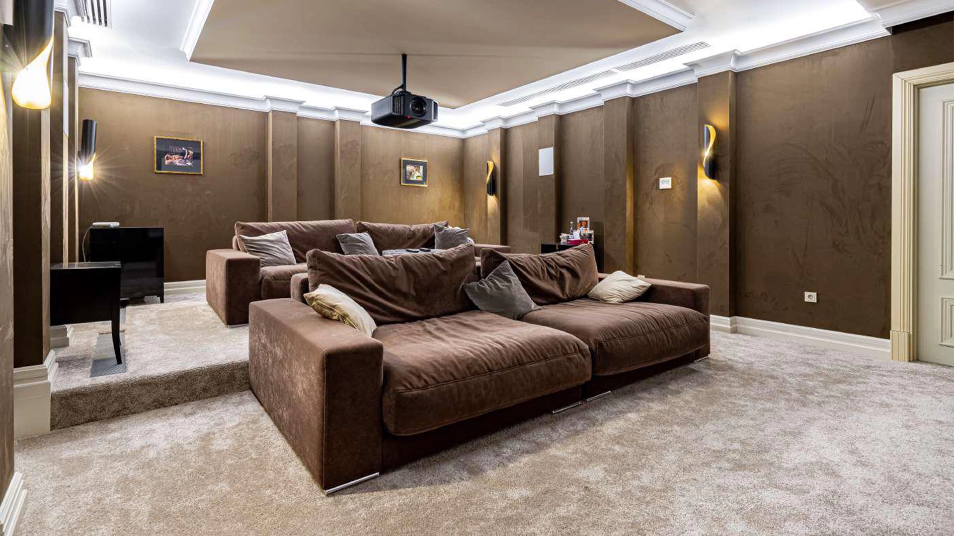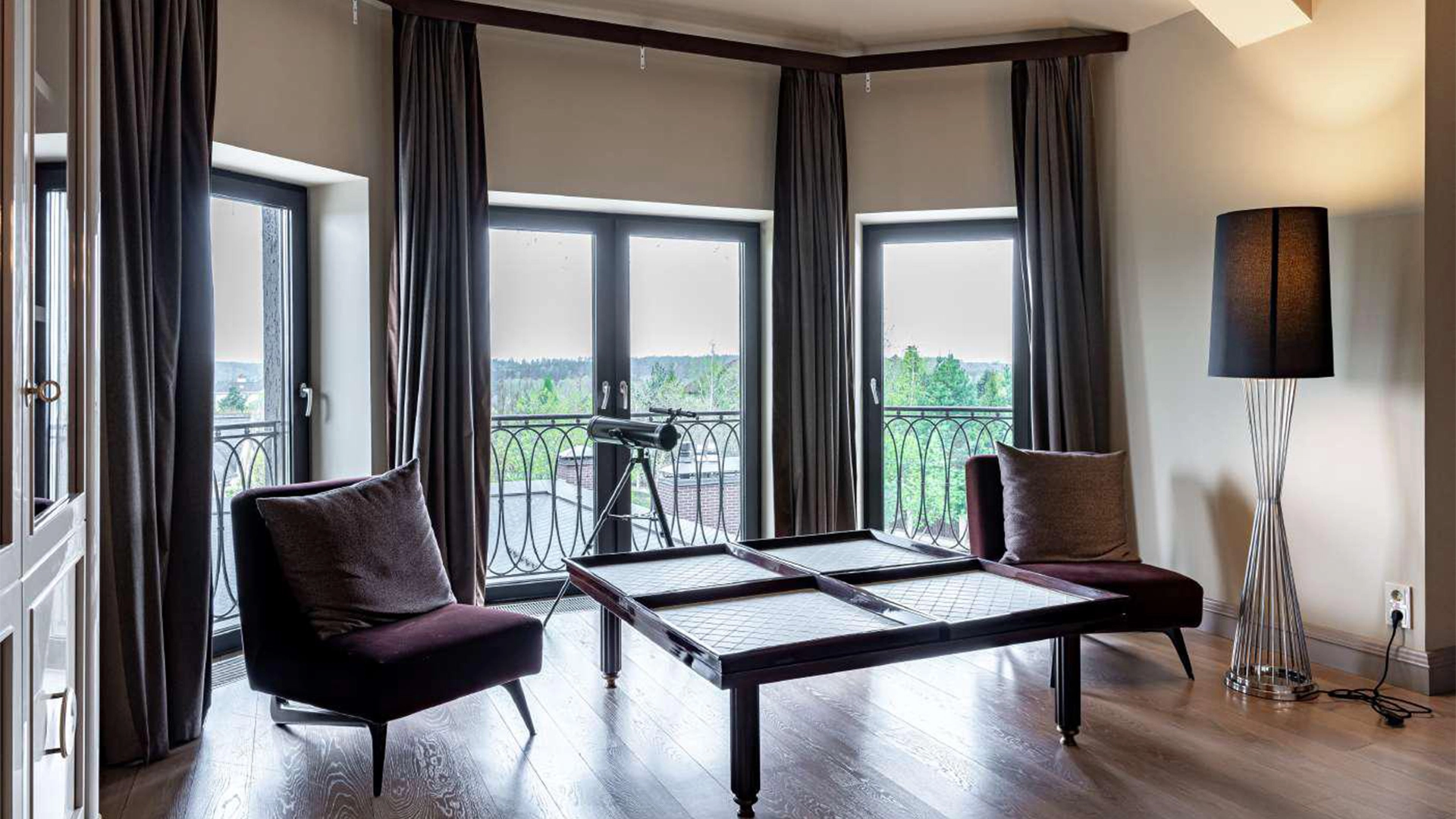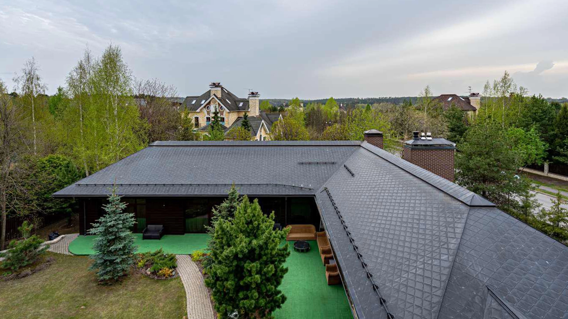 Для дополнительного комфорта оборудована система приточно-вытяжной вентиляции с кондиционированием. Планировка четырехуровневой резиденции включает просторную гостиную с камином и выходом на крытую летнюю террасу, кухню-столовую, 5 спален, кабинет, игровую, домашний кинотеатр, оружейную комнату и несколько гардеробных. Также в контуре дома находятся блок для персонала и 2 гаража, рассчитанные на 6 машин.