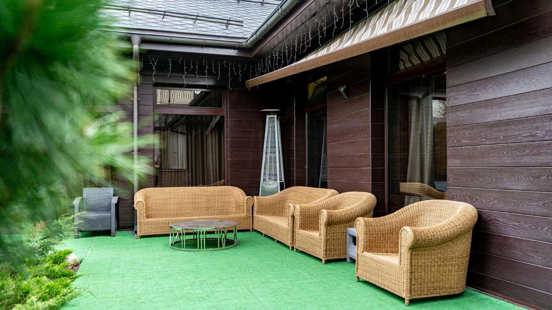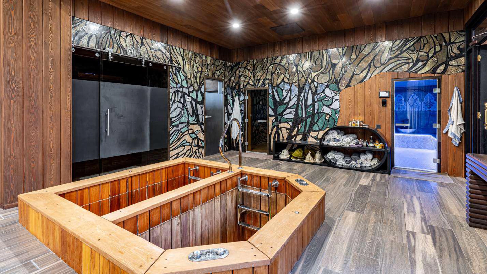 Через подземный переход можно попасть в SPA-комплекс, построенный рядом с основным зданием. В нем разместили бассейн 9х4 метра, русскую баню на дровах, хаммам, тренажерный зал, комнату отдыха с камином и помещение для барбекю. В рамках ландшафтного дизайна на участке прямоугольной формы засеян газон, высажены декоративные деревья и кустарники, вымощены дорожки, установлено уличное освещение и обустроены открытый паркинг и спортивная площадка. На огороженную территорию предусмотрены 2 въезда.