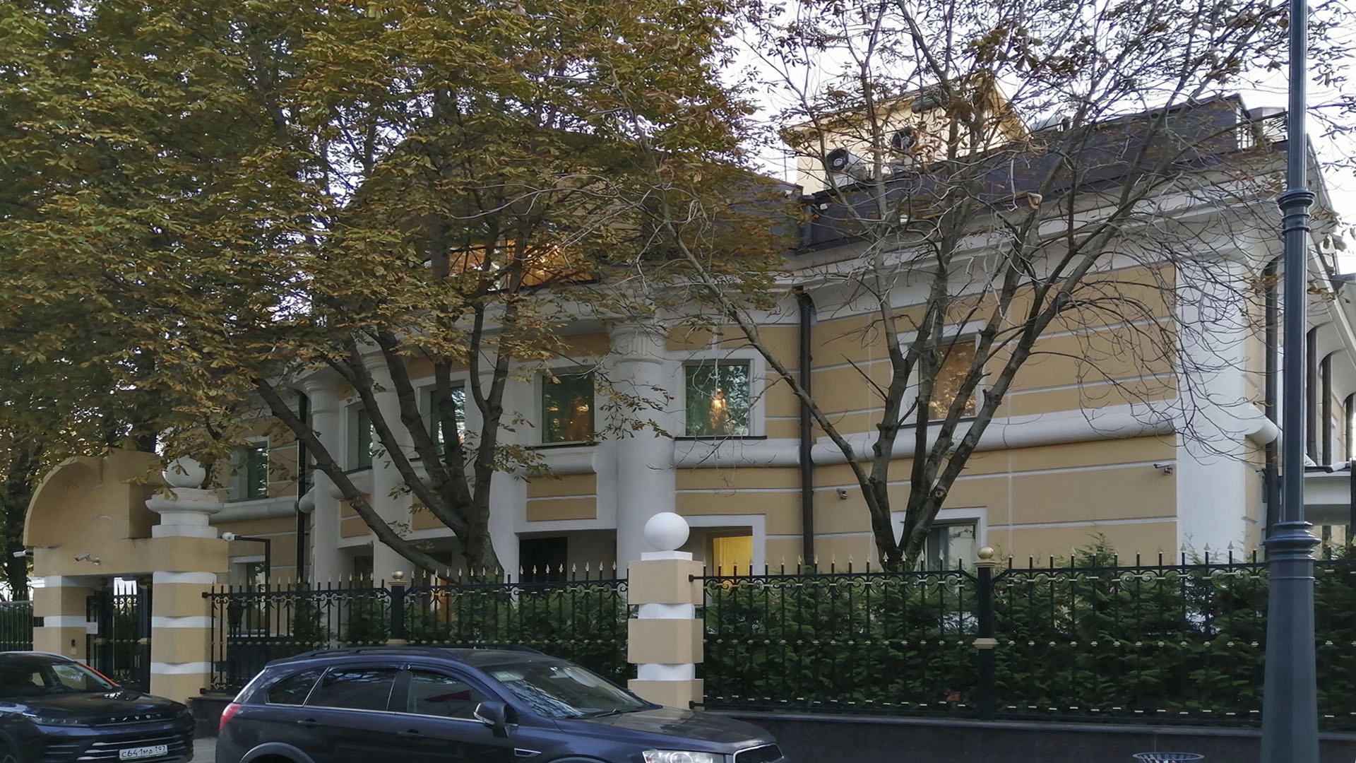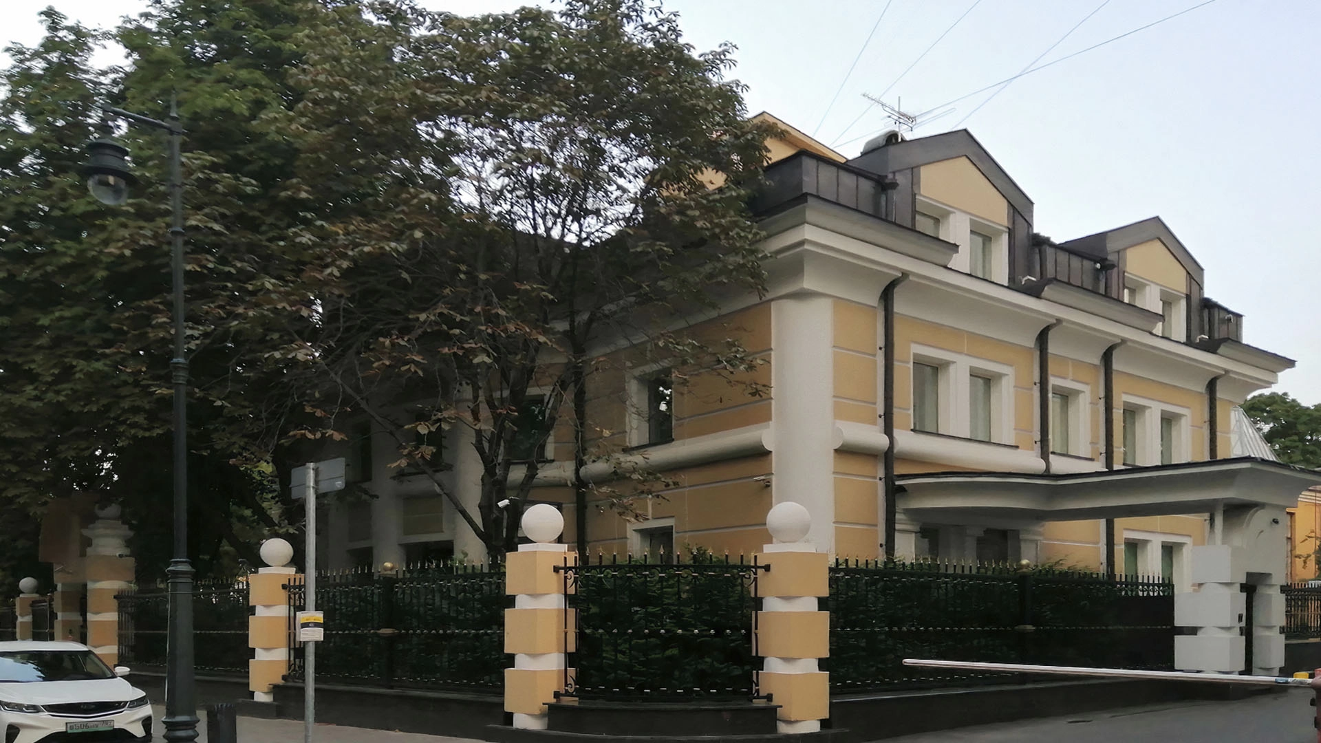 Двухэтажный особняк с мансардой расположен в Пречистенском переулке в районе Хамовники. Здание построено в 1995 году в стиле эклектика, с массивными монументальными рустами, карнизом и белыми колоннами на желтом фоне. Ограда выполнена в едином стиле с особняком. На территории разместили парковку на 4 машиноместа. Отдельно стоящее здание можно использовать как резиденцию или офис.